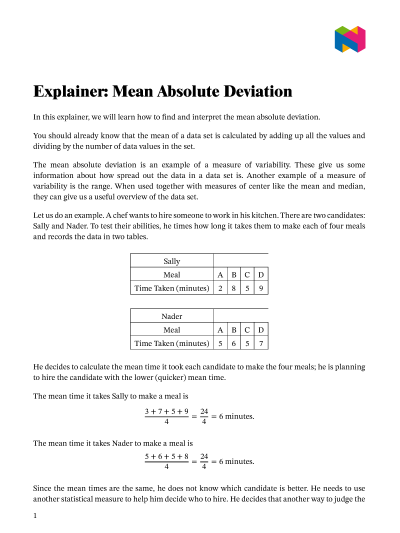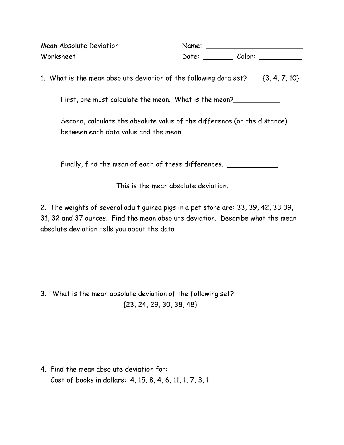 Worksheets on absolute deviation typically consist of a series of data sets for which students need to calculate the absolute deviation. This involves finding the difference between each data point and the mean of the data set, and then taking the absolute value of that difference. By working through these problems, students can improve their skills in calculating absolute deviation and interpreting the results.