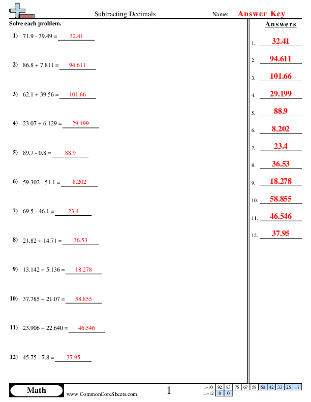 Subtracting decimals is another important skill that students can practice with these worksheets. Similar to addition, students need to align the decimal points and then subtract the numbers as if they were whole numbers. This process helps students understand the importance of place value when working with decimals and reinforces the concept of borrowing when necessary.