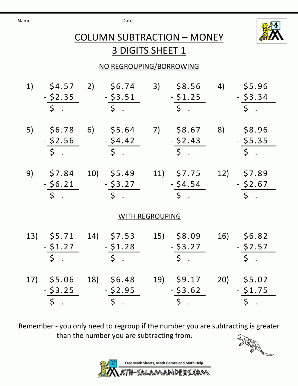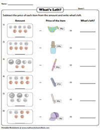 Subtracting money worksheets, on the other hand, focus on teaching students how to subtract amounts of money to find the difference. These worksheets can also include word problems that involve calculating change or finding the remaining balance after making a purchase.