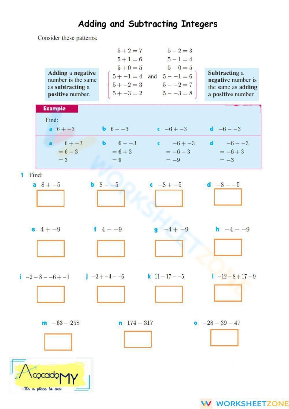 Adding and Subtracting Integers Worksheet