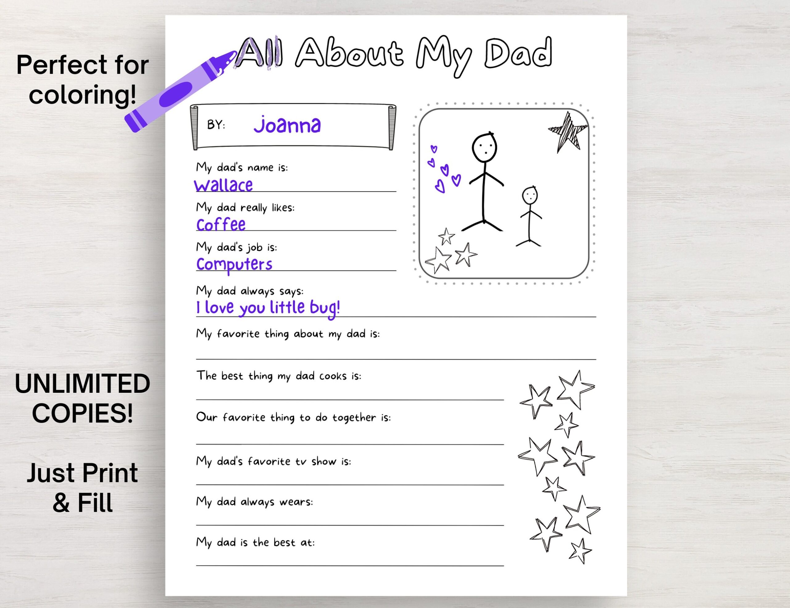 In conclusion, the “All About My Dad” printable card is a wonderful way to express your love and appreciation for your dad. Take the time to fill out the template and create a personalized gift that will touch his heart. Show your dad how much he means to you with this thoughtful gesture on Father’s Day.