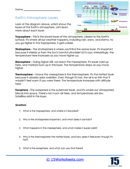 One common type of question found on atmospheric layers worksheets is matching. Students may be asked to match the name of each layer with its corresponding description or characteristic. This activity helps reinforce the key features of each atmospheric layer and tests students’ ability to recall and identify them accurately.