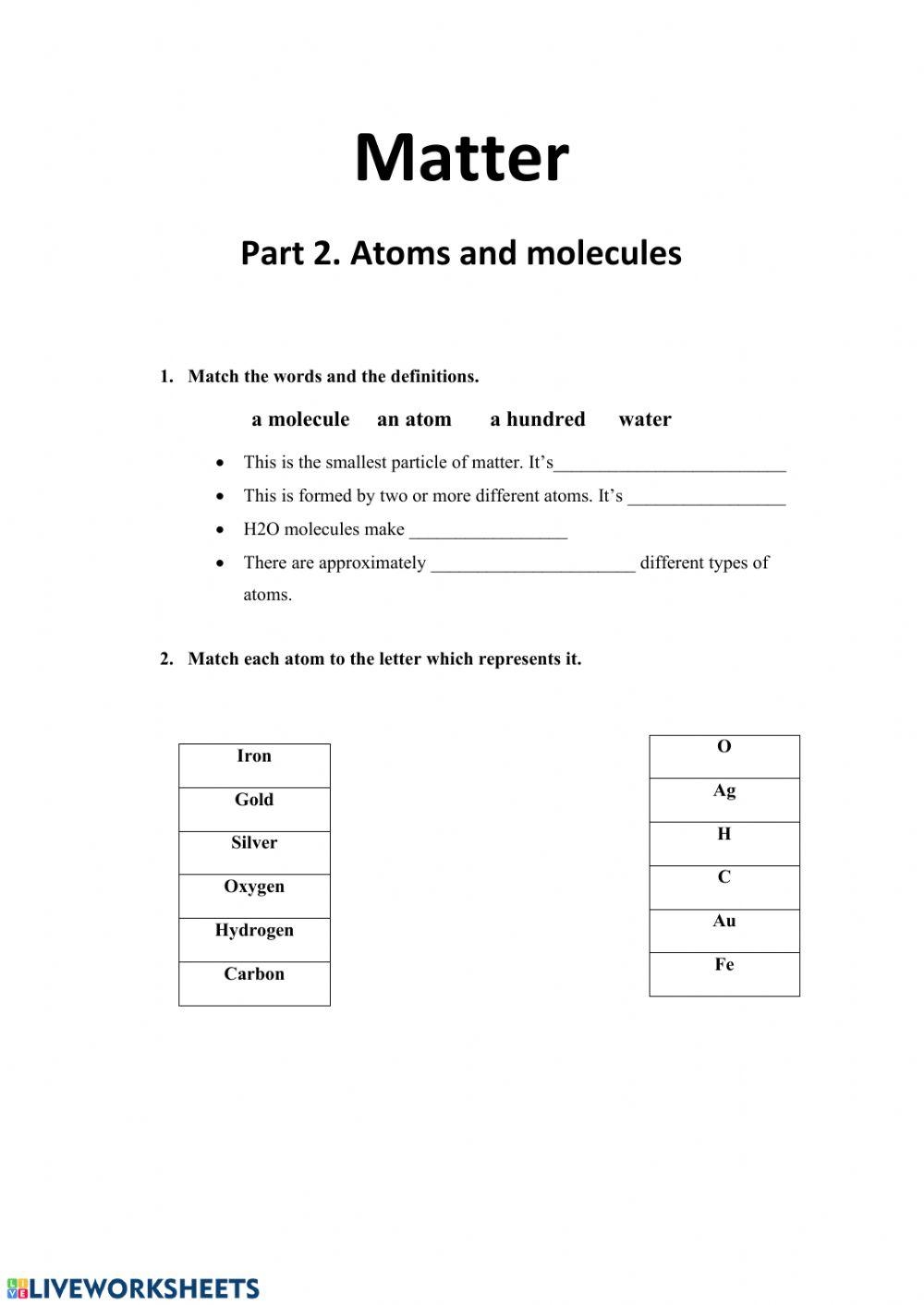 Atoms and molecules are the building blocks of matter, and understanding their structure and behavior is essential in the study of chemistry. Worksheets are a great way for students to practice and reinforce their knowledge of atoms and molecules. These worksheets typically include questions on atomic structure, chemical bonds, and the properties of different elements and compounds.
