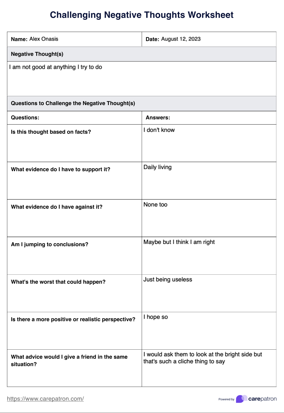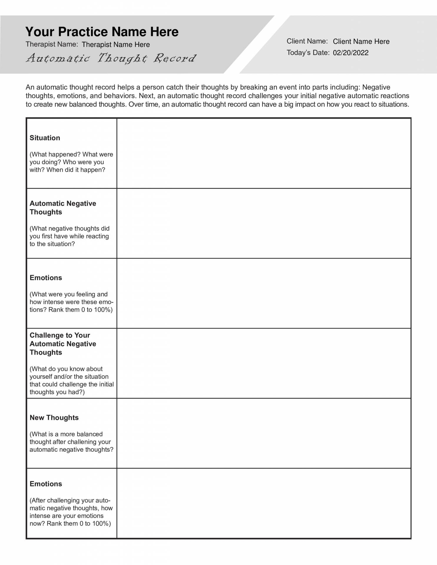 One way to identify and work through automatic thoughts is by using a worksheet. This tool helps individuals become more aware of their thoughts and provides a structured way to challenge and reframe them.