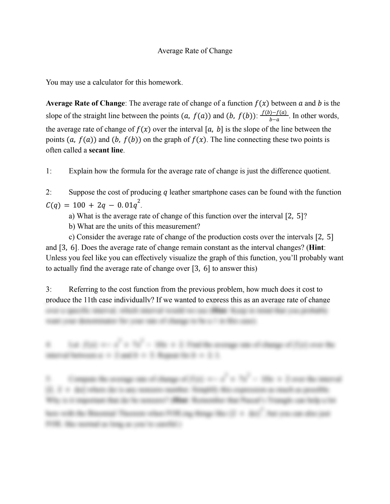 One common type of problem found on average rate of change worksheets involves determining the average rate at which a quantity is changing over a specific interval. Students are usually given two points on a graph or table and asked to calculate the average rate of change between those points. This helps students understand how to calculate slopes and rates of change in different contexts.