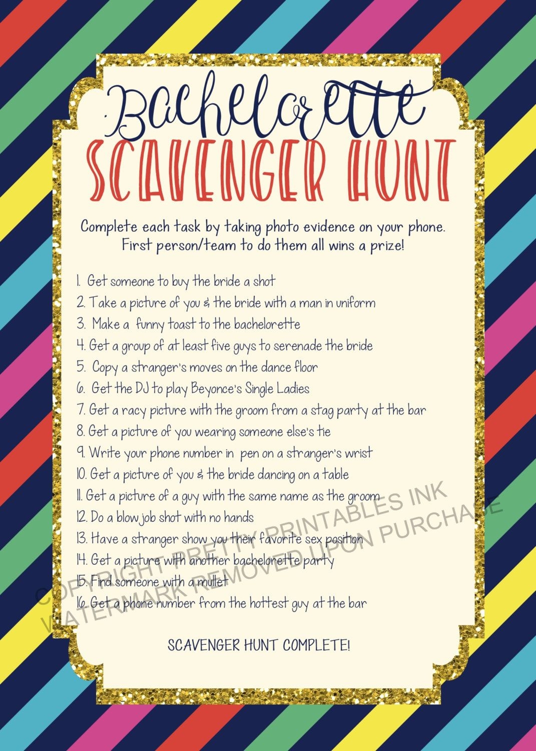 Another popular printable game is the “Bachelorette Scavenger Hunt.” This game involves creating a list of tasks or items for guests to find or complete throughout the party. From taking selfies with strangers to dancing with a cute bartender, the scavenger hunt is sure to get everyone laughing and bonding over the shared experience.