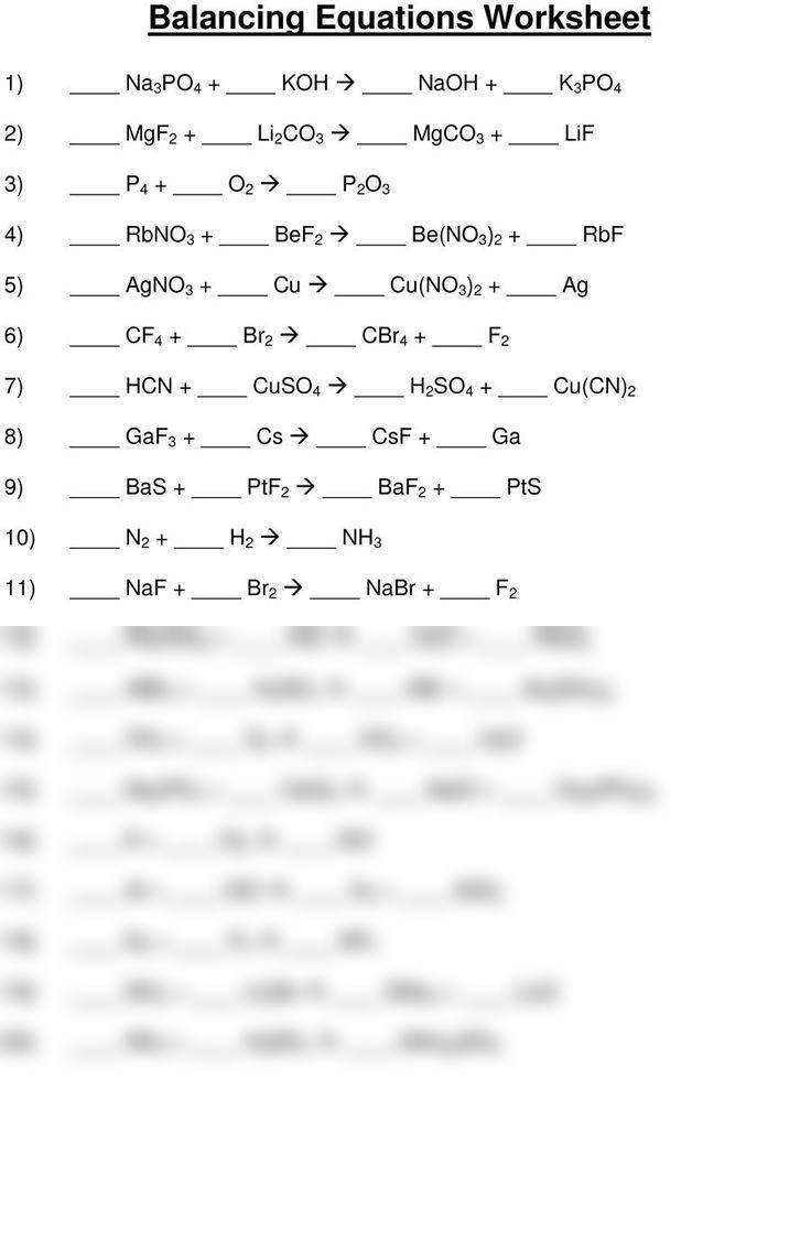 When using a balancing equation worksheet, students are presented with a variety of chemical reactions that need to be balanced. These reactions may involve different types of compounds, such as acids, bases, salts, or gases. Students must carefully analyze the equation, identify the elements involved, and then adjust the coefficients to ensure that the number of atoms is the same on both sides.