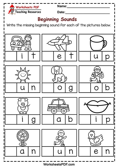 These worksheets typically feature pictures of objects or animals, with the corresponding beginning letter missing. Children are then tasked with identifying the correct beginning sound and writing it down. This activity helps them strengthen their phonemic awareness and letter recognition skills.