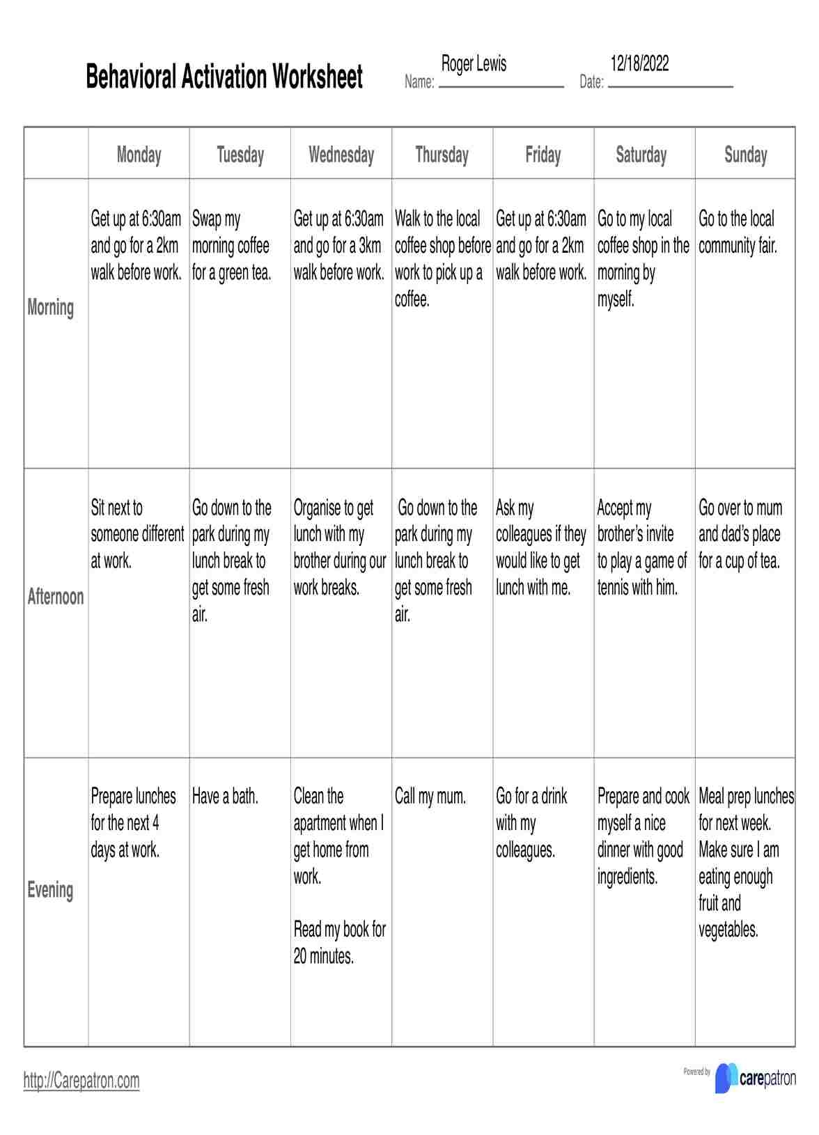 Behavioral Activation Worksheet Example Free PDF Download