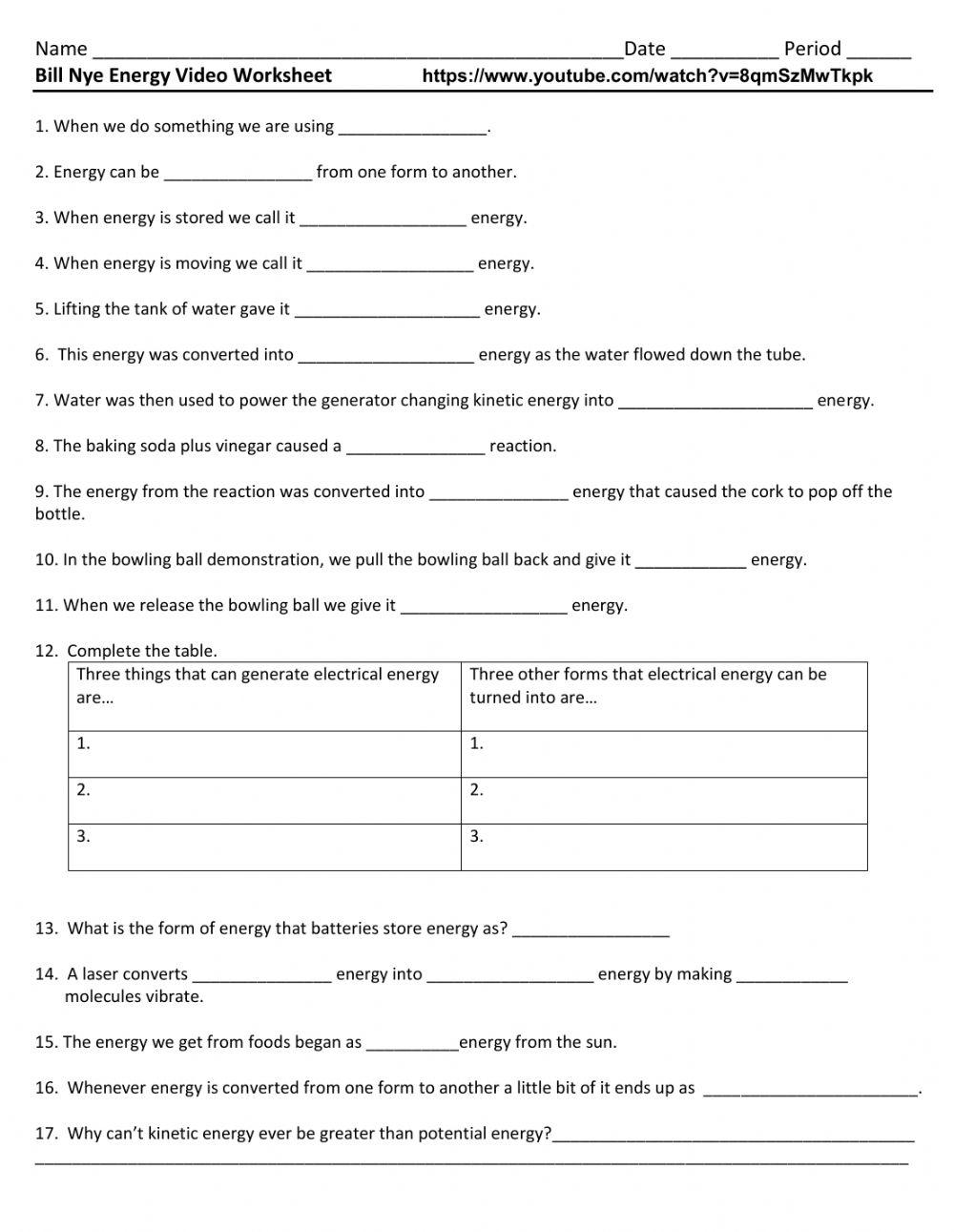 Bill Nye Energy Worksheet PDF