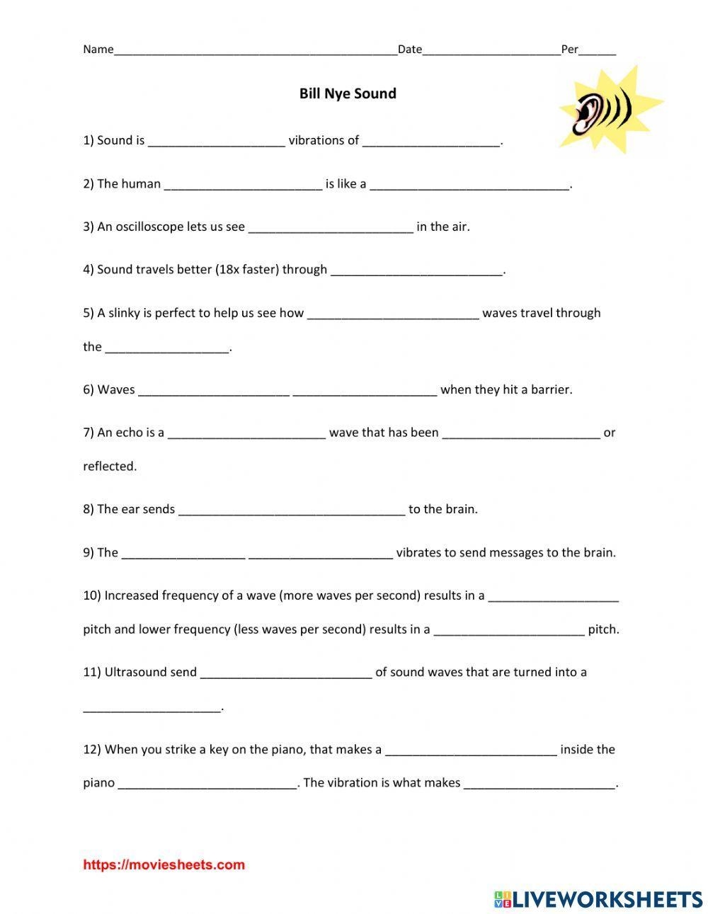 In the Bill Nye Sound Worksheet, students will explore the science behind how sound is produced, how it travels, and how it can be heard. This interactive and engaging resource is a great way for students to learn about the properties of sound and the important role it plays in our everyday lives.