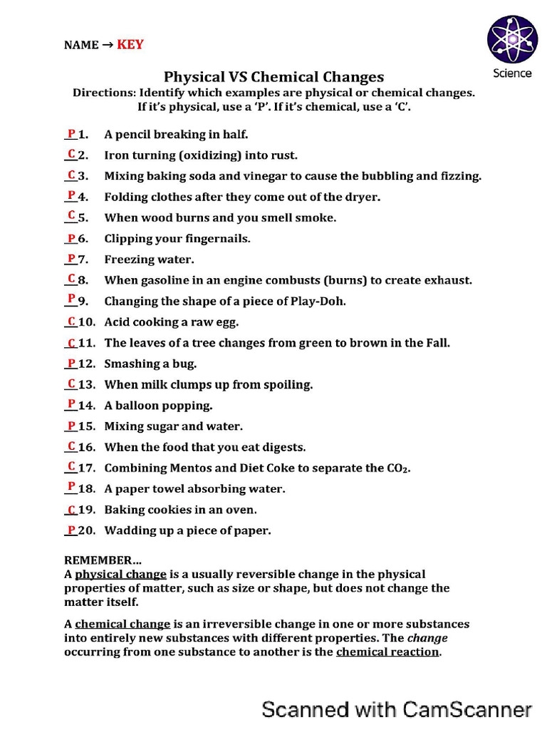 Worksheets that focus on chemical change and physical change are important tools for students to practice identifying and differentiating between the two types of changes. These worksheets typically include a variety of scenarios where students have to determine whether a given change is chemical or physical based on observable characteristics and knowledge of chemical reactions.