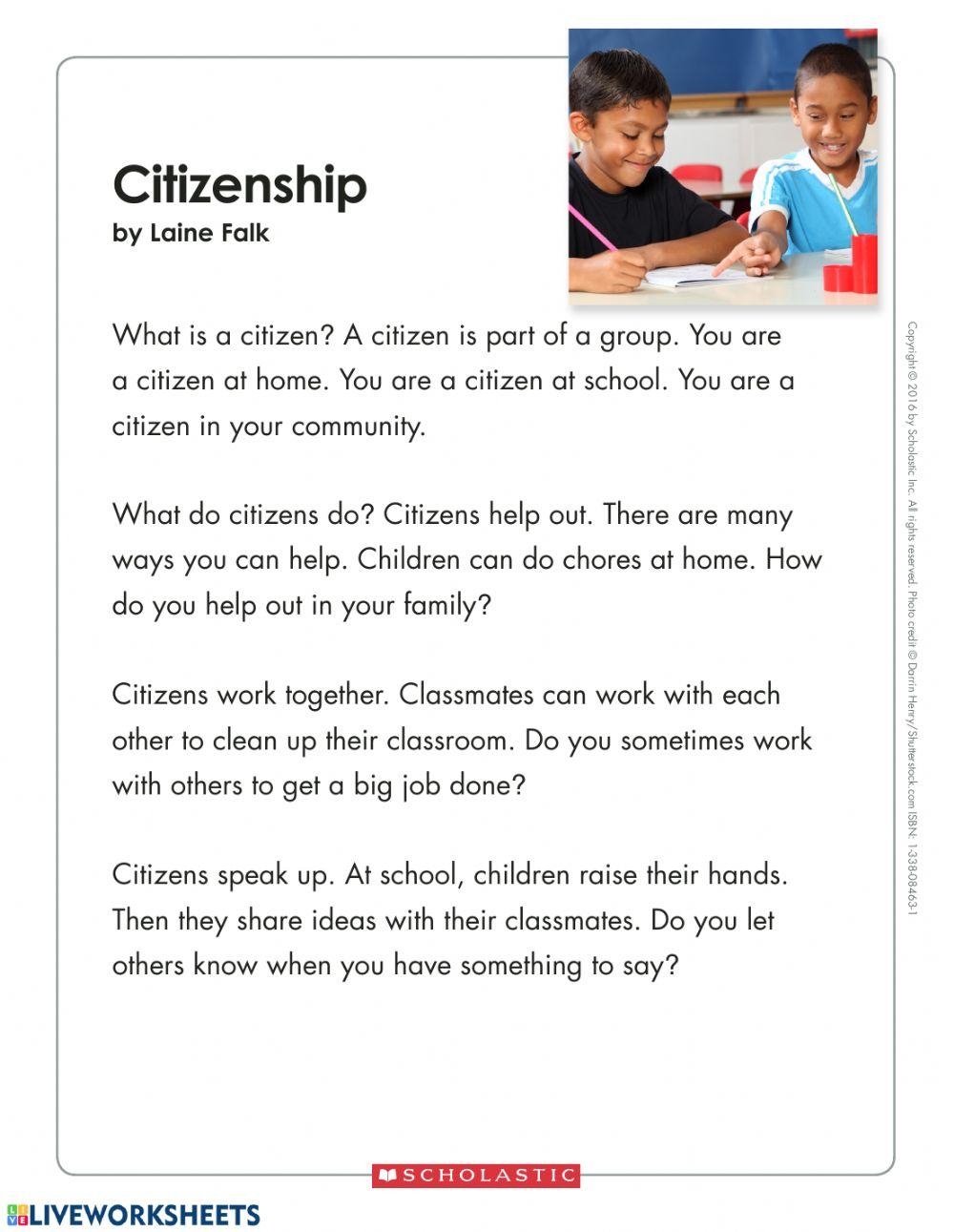 A citizen in the community worksheet is a tool that helps individuals reflect on their responsibilities as members of society. These worksheets may contain questions about the importance of community involvement, ways to give back, and the benefits of participating in local initiatives. By completing these worksheets, individuals can gain a better understanding of their role in creating a thriving and inclusive community.