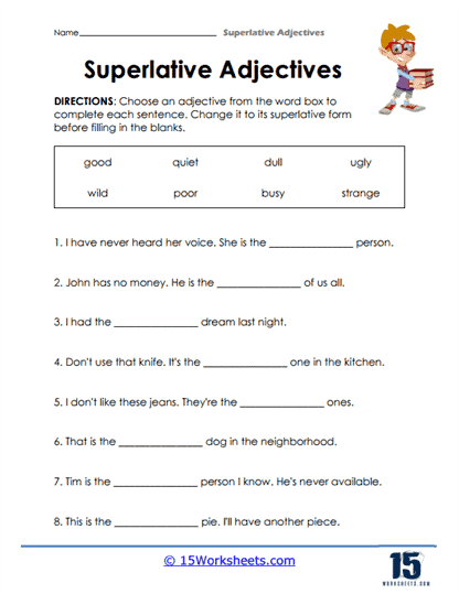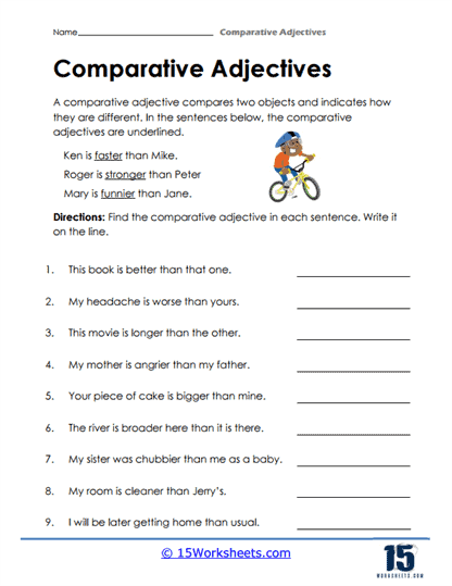 Comparative adjectives are used to compare two or more things, showing the differences in size, quantity, or quality. These worksheets typically include exercises where students have to fill in the blanks with the correct form of the adjective, or compare two objects using the appropriate comparative form. By practicing with these worksheets, students can improve their understanding of how to use comparative adjectives correctly in sentences.