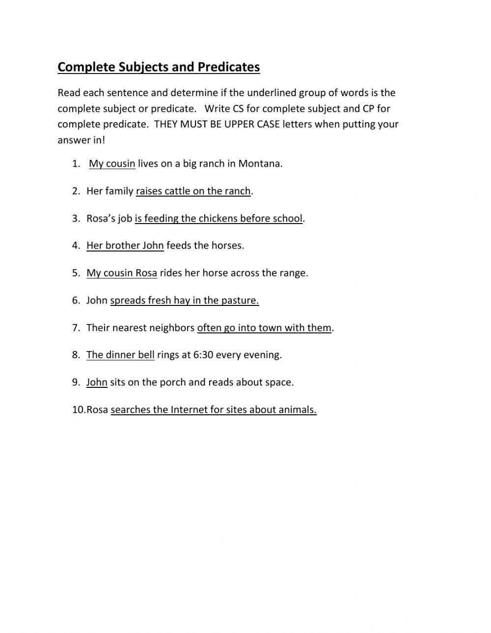 Complete Subject and Predicate Worksheet