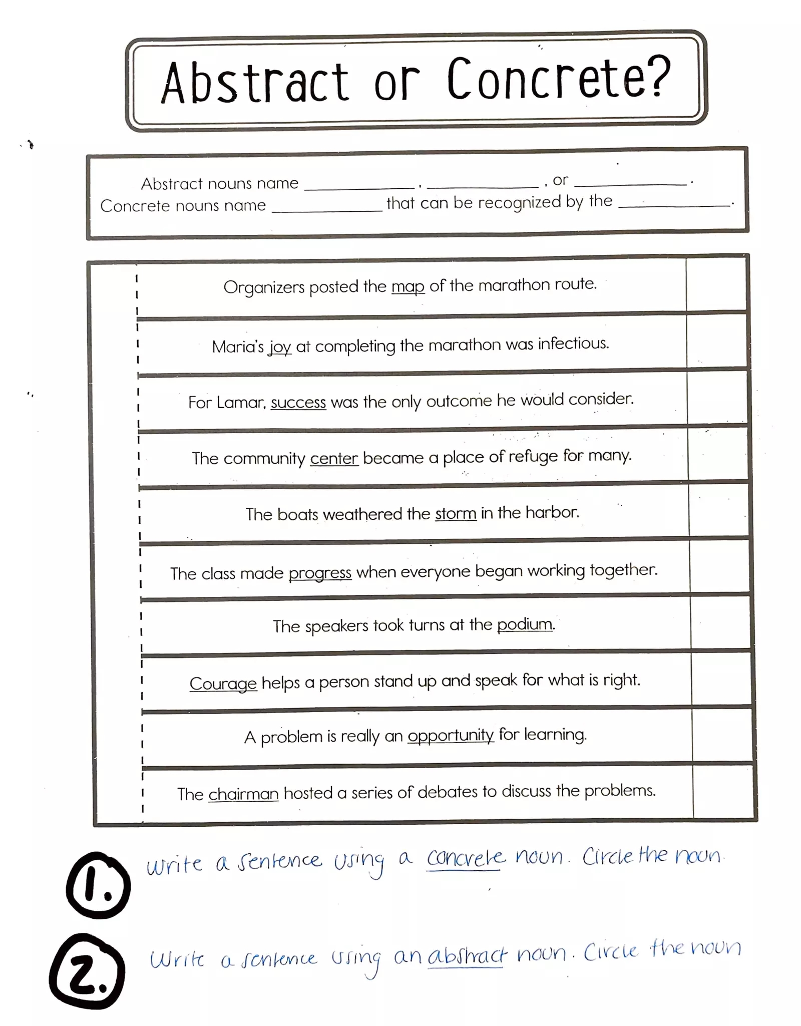 By completing this worksheet, students will strengthen their ability to identify and use concrete and abstract nouns in their writing. This skill is essential for creating clear and descriptive sentences that effectively communicate ideas and emotions to the reader.