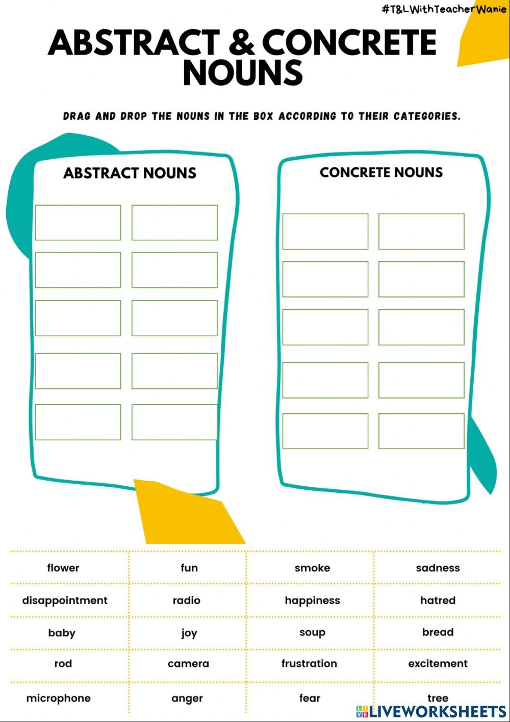 Concrete abstract nouns are a type of noun that represent things that are tangible or physical, as opposed to abstract nouns which represent ideas or concepts. This worksheet is designed to help students identify and differentiate between concrete and abstract nouns.