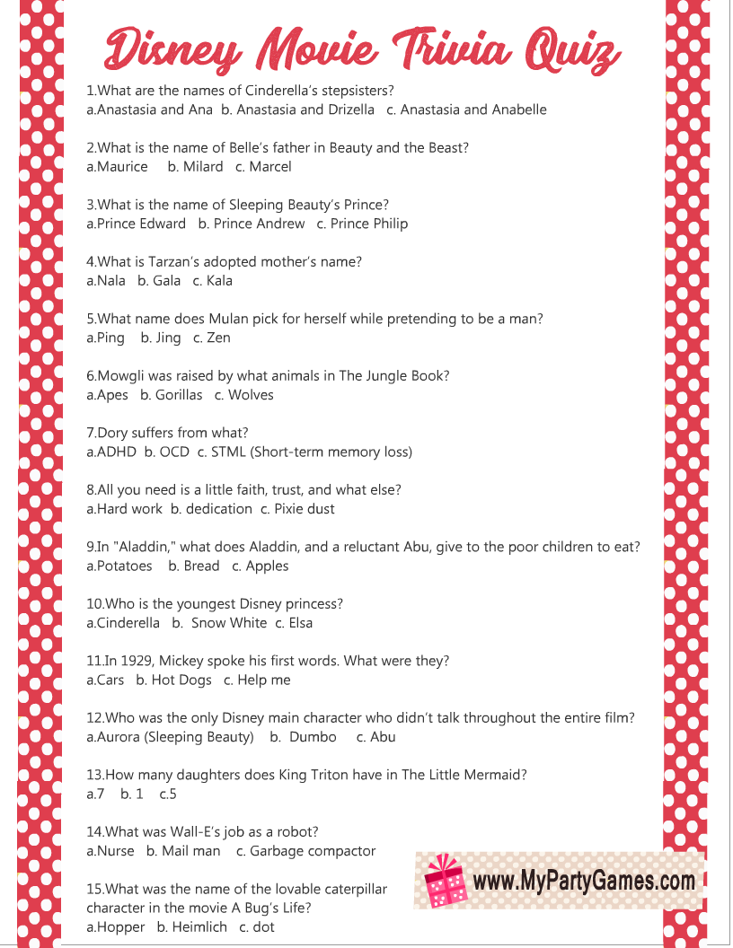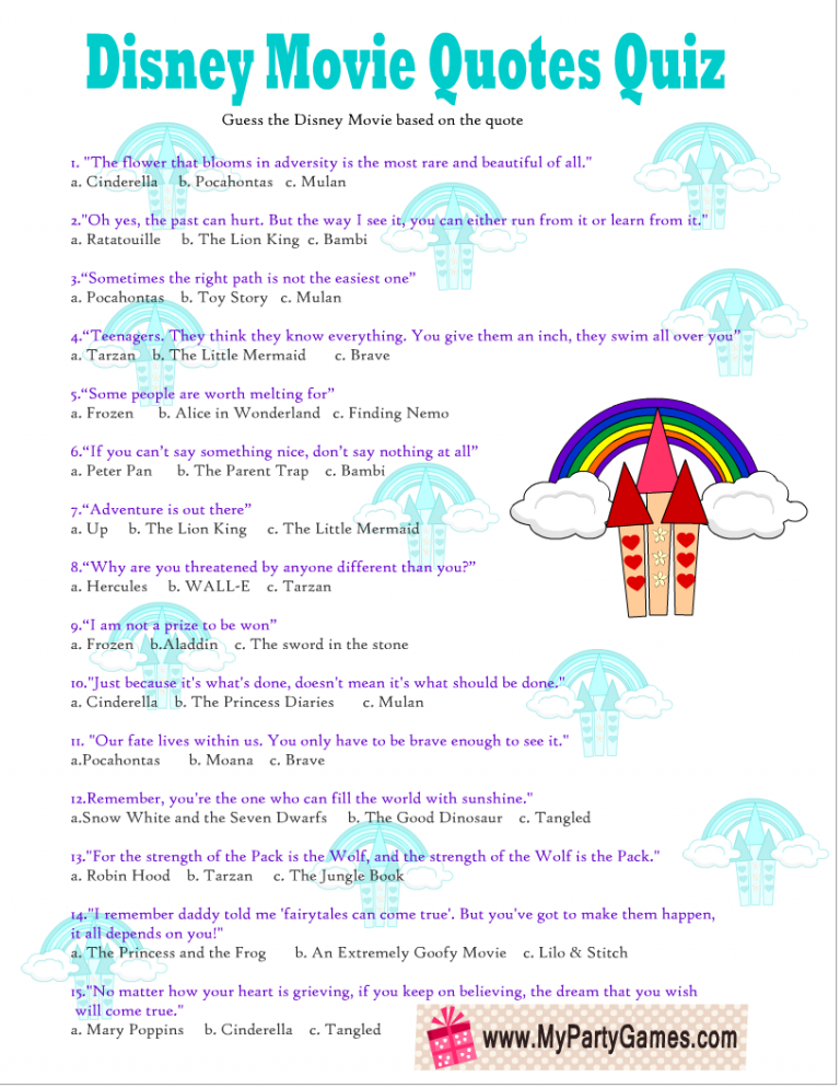So grab a pen and paper, print out this quiz, and get ready to dive into the wonderful world of Disney! Have fun and good luck!
