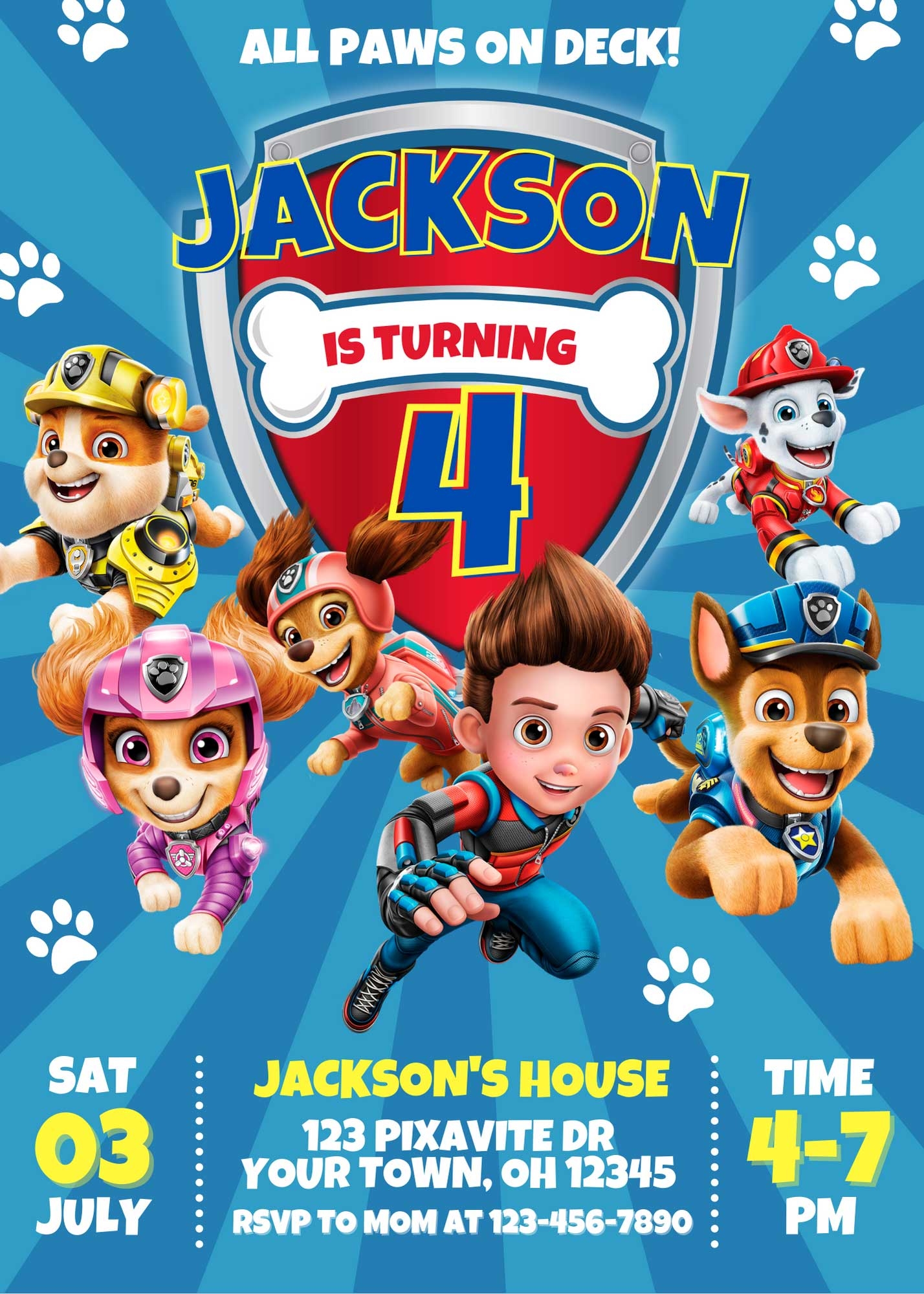 Whether you’re hosting a Paw Patrol themed party at home or at a venue, our invitation template is versatile and can be customized to suit your party’s unique style. Add in the date, time, location, and any other important information to ensure your guests know all the details they need to join in on the fun.