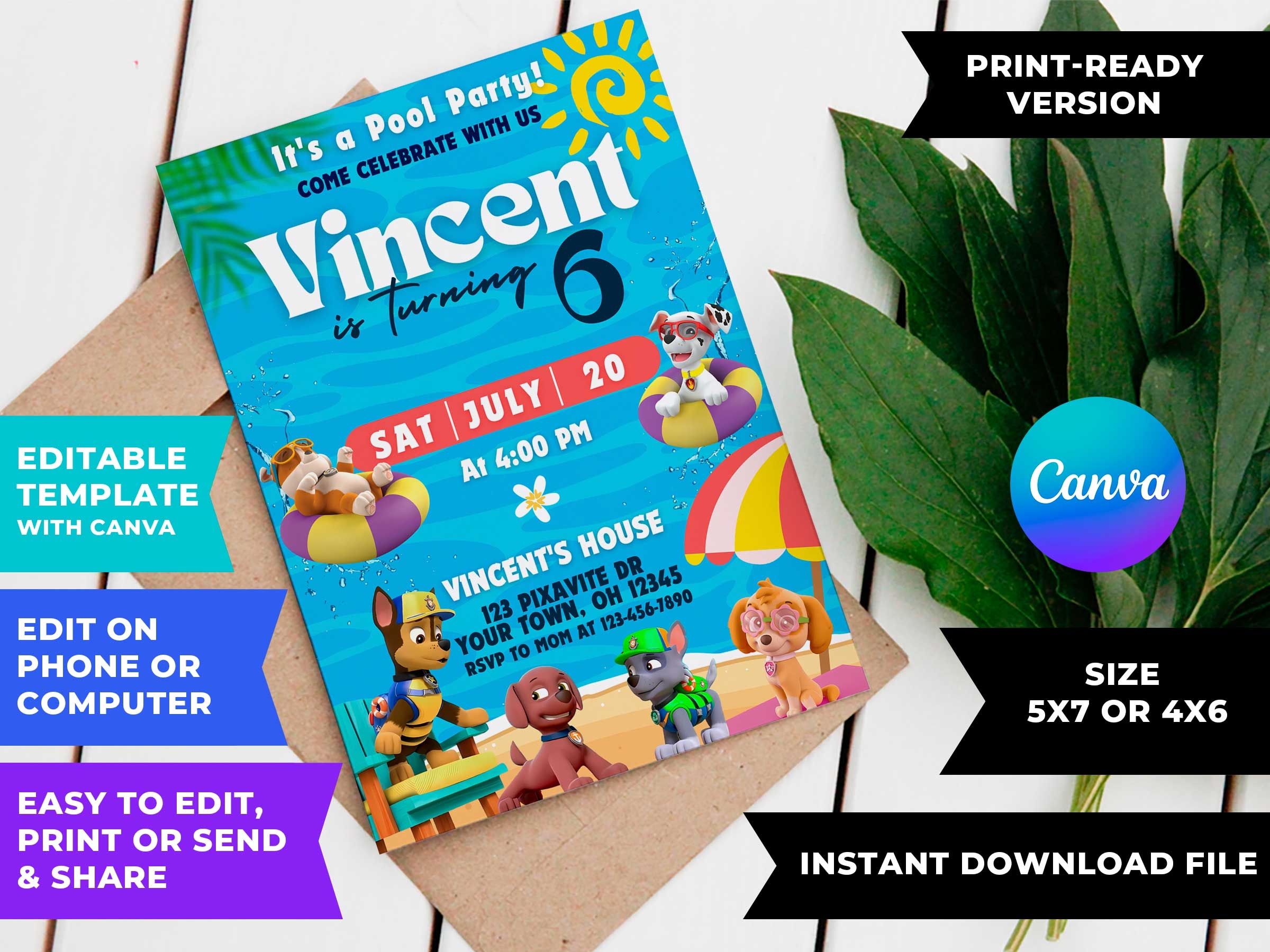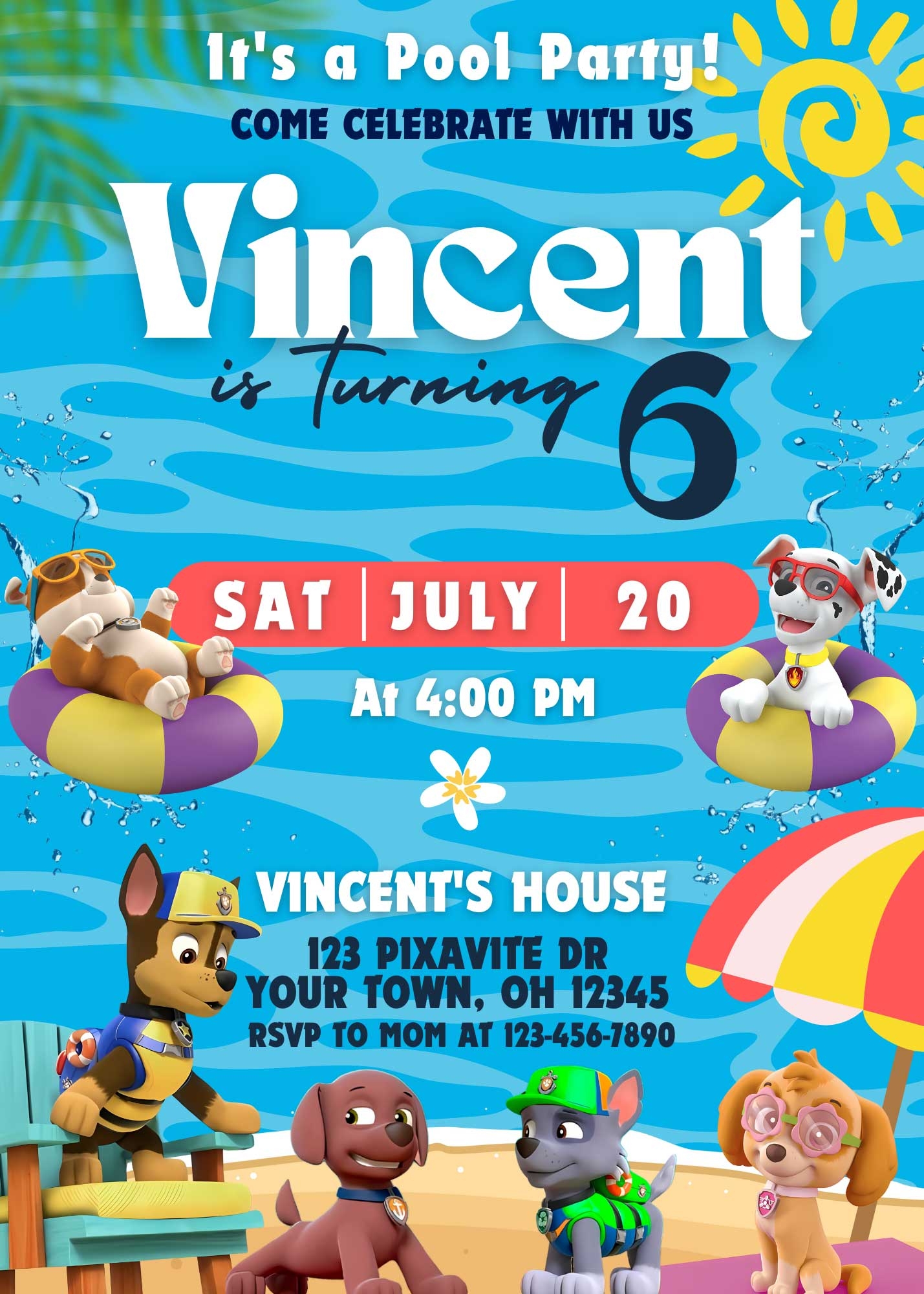 Our Paw Patrol pool party invitation template is designed to capture the spirit of the show and get kids excited for a day of splashing and playing. With vibrant colors, playful graphics, and space to customize the details of your event, this template is sure to make a paw-some impression on your guests. Simply fill in the date, time, location, and any other important information, then print or send digitally to all your little party guests.