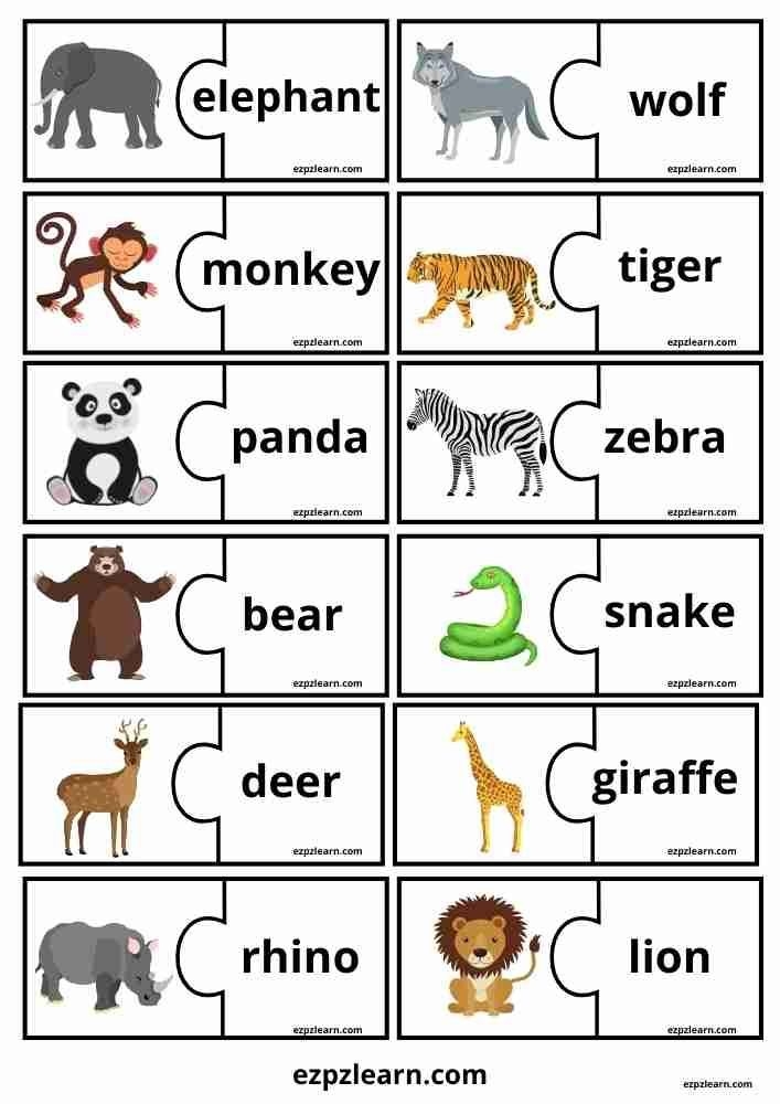 Free Printable Wild Animals Puzzle Match Game For ESL Kids