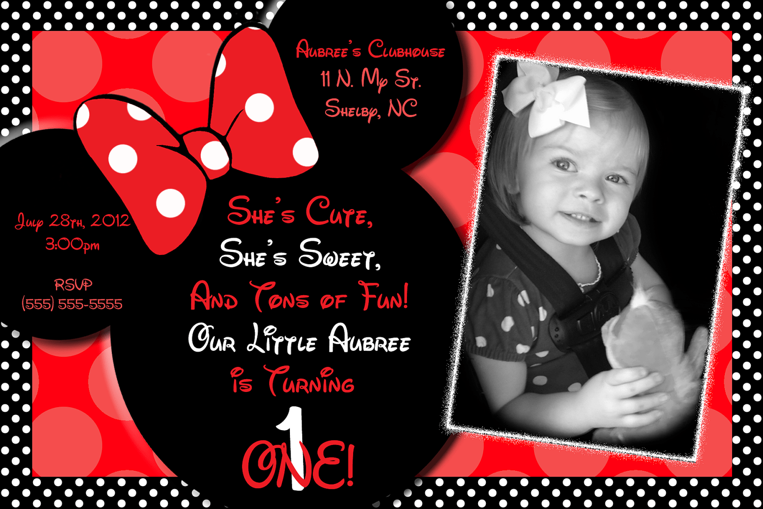 Our red Minnie Mouse invitation template features a vibrant red background with a cute Minnie Mouse illustration in the center. The design is accented with white polka dots and a bold black border, giving it a fun and playful look that is sure to delight your guests.
