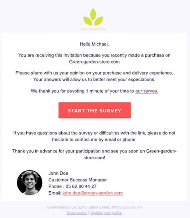 Lastly, don’t forget to include a clear call to action at the end of the email. Use a prominent button or link that directs recipients to the survey landing page. Encourage them to take action and participate in the survey by highlighting the benefits or impact their feedback will have. Follow up with a thank you message for their time and consideration.