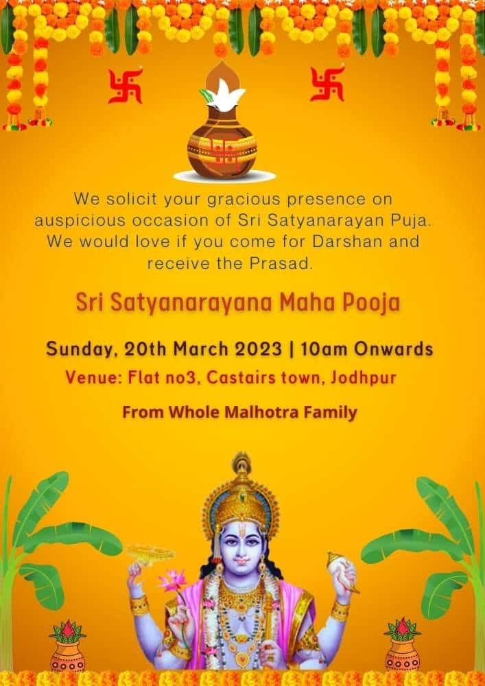 Make your Satyanarayan Pooja a memorable and special occasion by using our free invitation templates. Download now and start spreading the joy of this sacred ceremony with your nearest and dearest!