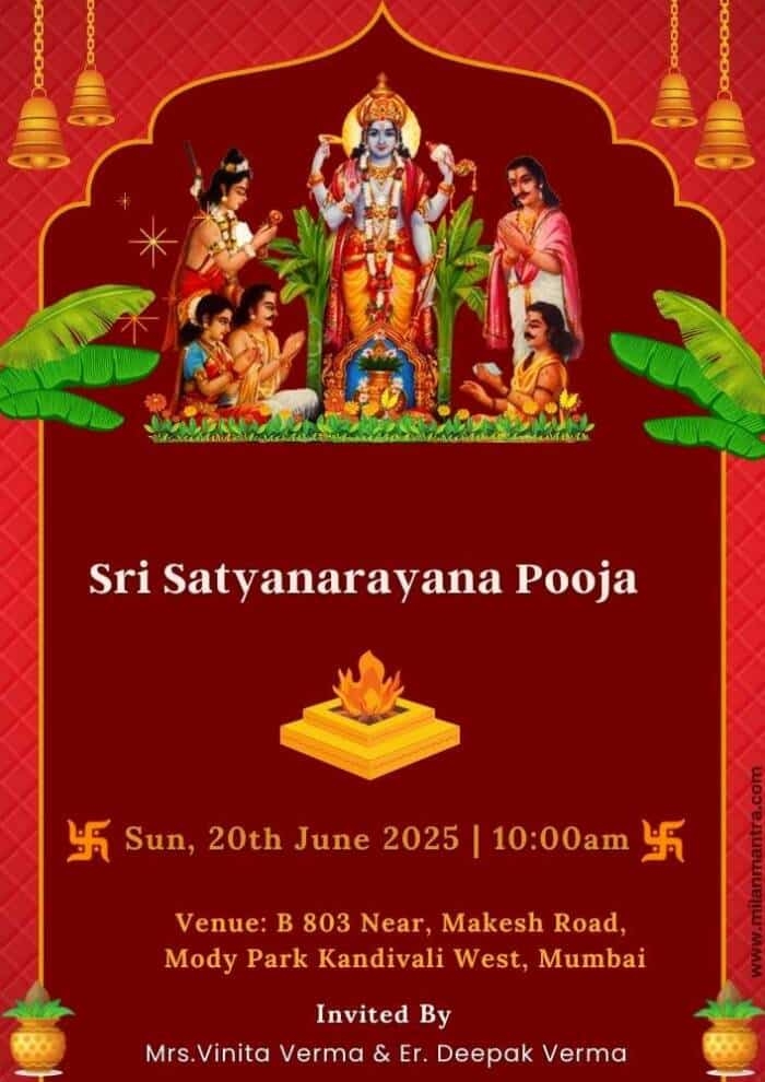 Invite your friends and family to come together for a spiritual and joyous occasion with a personalized Satyanarayan Puja invitation that reflects the beauty and significance of the event. We hope that this template helps you create an invitation that sets the tone for a memorable and auspicious gathering.