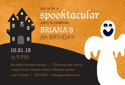 1. Haunted House: This template features a spooky haunted house silhouette against a full moon backdrop. The ghostly font adds to the overall eerie vibe, making it perfect for a haunted house party.