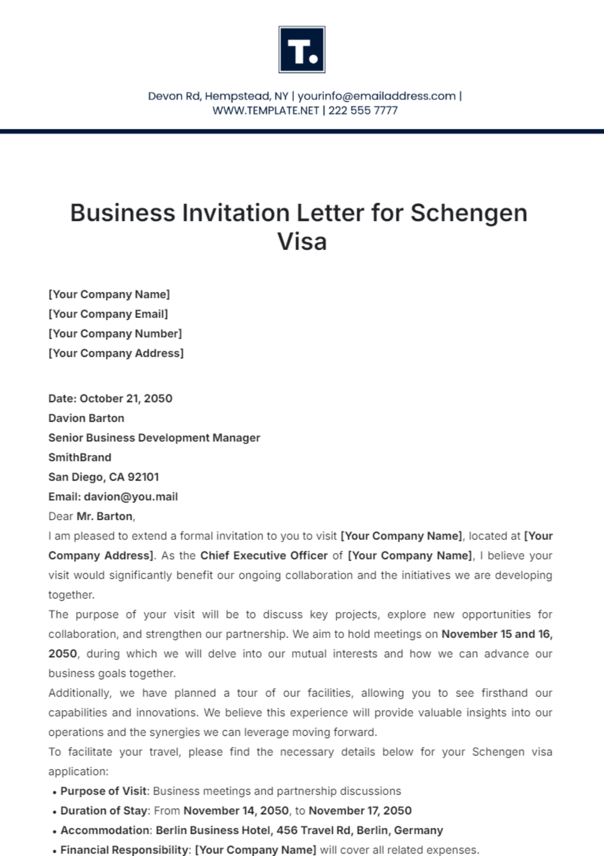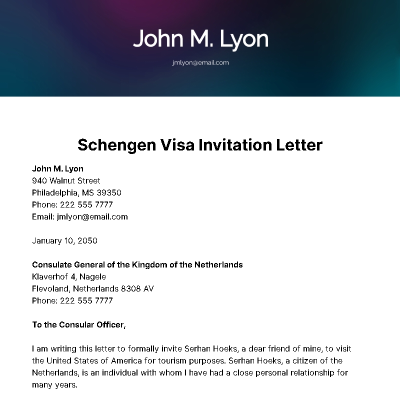 By following this template and providing all the required information, you can increase the likelihood of your Schengen visa application being approved. Remember to submit your invitation letter along with the other required documents and to follow the guidelines provided by the embassy or consulate to avoid any delays or issues with your visa application.