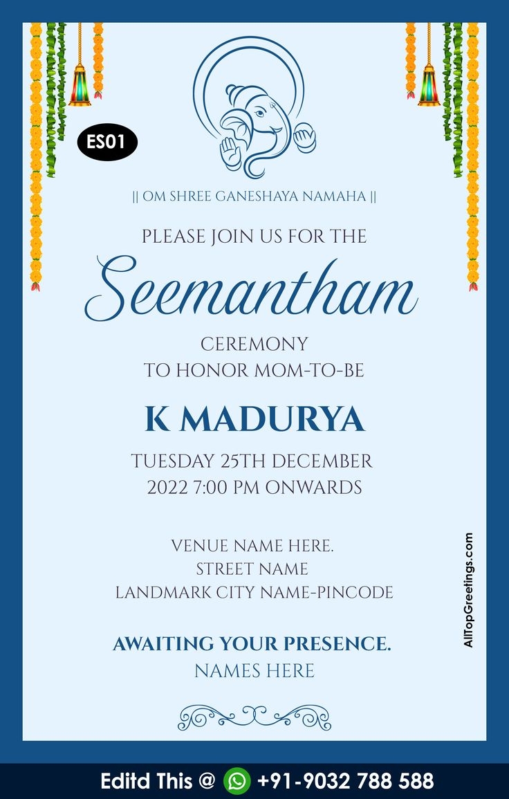 Seemantham, also known as baby shower, is a special occasion for expecting mothers to celebrate the impending arrival of their little one. It is a time for friends and family to come together and shower the mother-to-be with love and blessings. What better way to invite your loved ones to this joyous event than with a stunning invitation template?