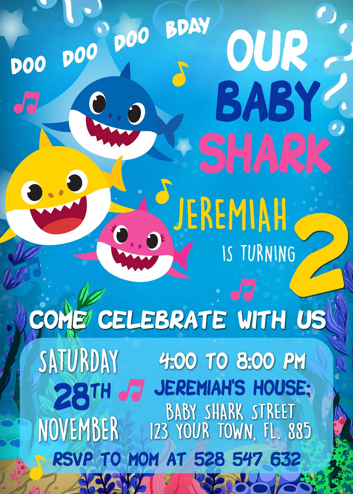Our shark birthday party invitation template allows you to easily personalize the details of your event, such as the date, time, location, and RSVP information. You can also add a special message or note to your guests to build excitement for the party. Whether you’re hosting a pool party, beach bash, or underwater adventure, our template is versatile and can be tailored to suit your theme.