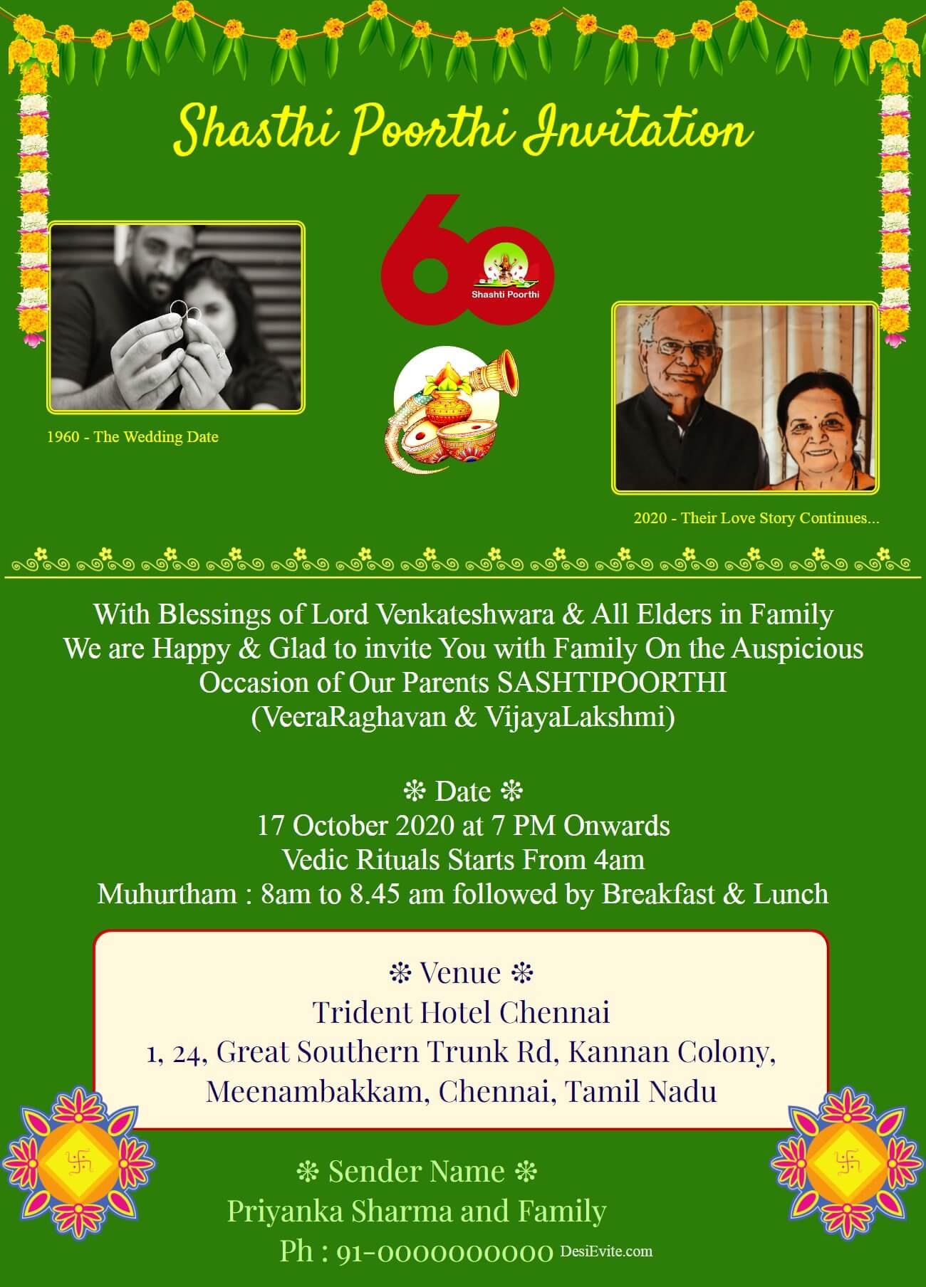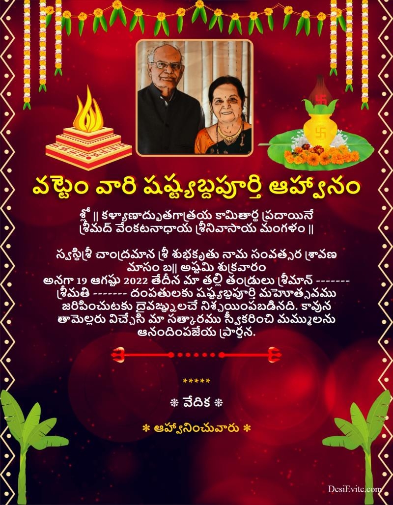 Get started today and make your shashtipoorthi celebration truly unforgettable with beautifully designed and personalized invitations that reflect the significance of this milestone occasion.