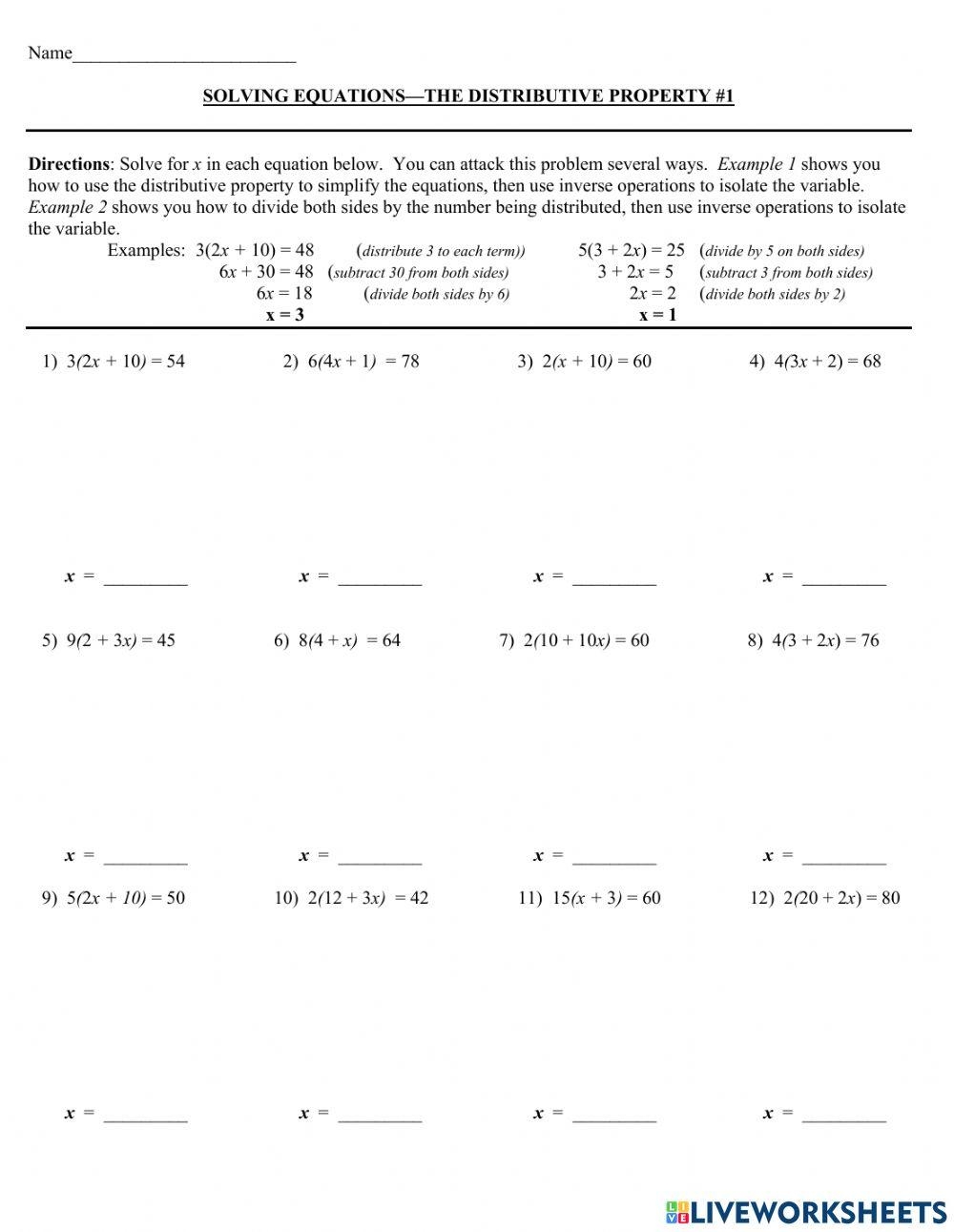 One way to practice and reinforce the concept of solving equations with the distributive property is through worksheets. These worksheets typically contain a series of equations that require students to apply the distributive property to simplify and solve them. By working through these problems, students can develop their skills and gain confidence in using the distributive property.