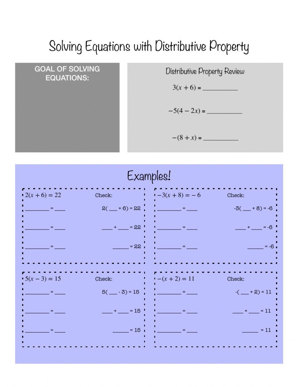 Solving Equations with Distributive Property Worksheet