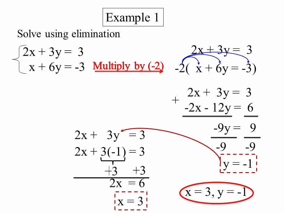One common approach to solving systems by elimination is to first multiply one or both of the equations by a constant so that the coefficients of one of the variables are the same. This allows the equations to be added or subtracted in order to eliminate that variable. By continuing this process, the remaining variable can be solved for, leading to the solution of the system of equations.