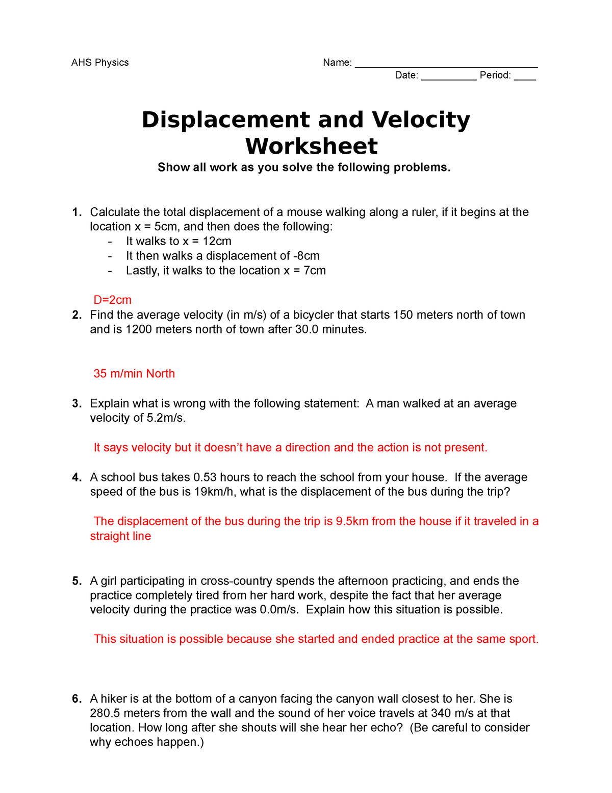 Displacement And Velocity Worksheet AHS Physics Name Date