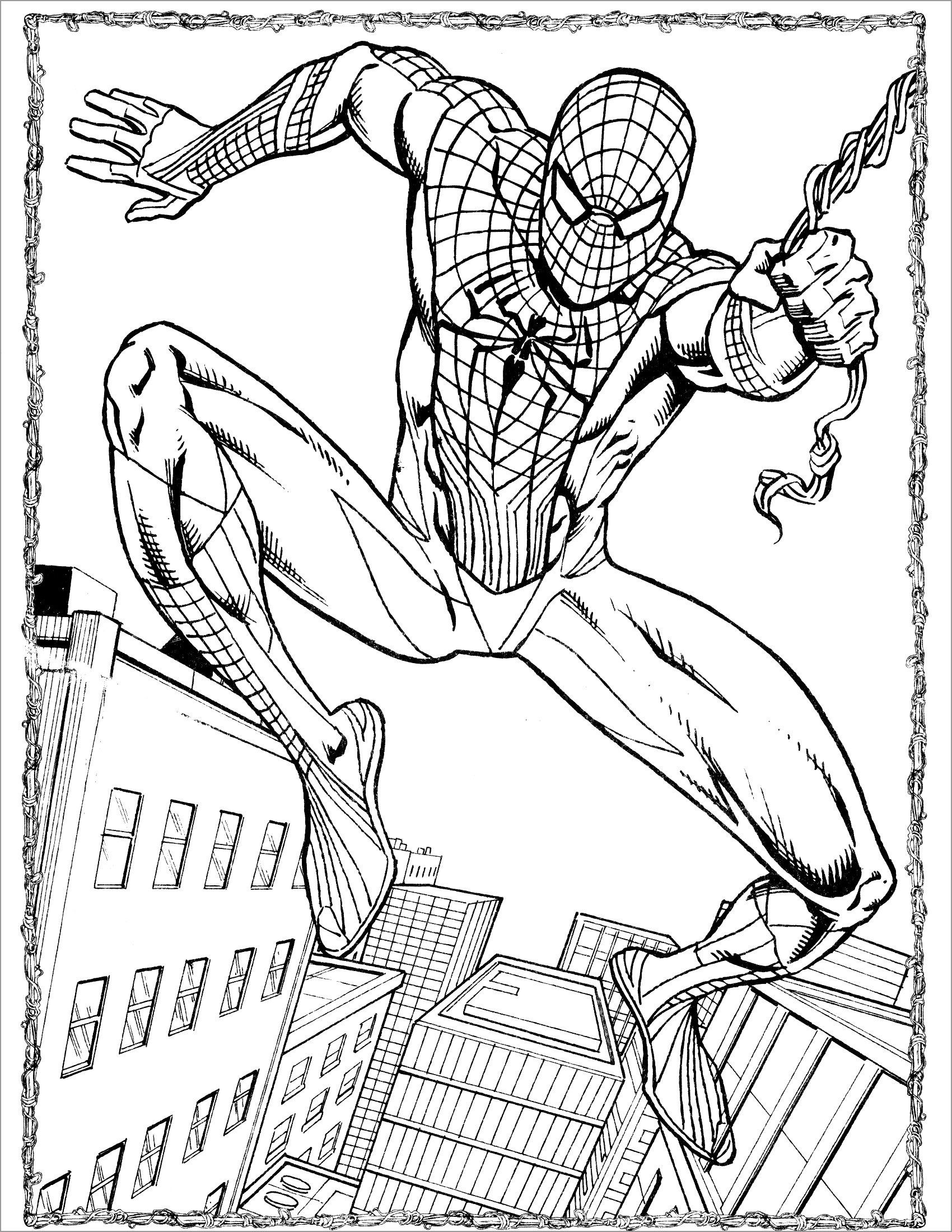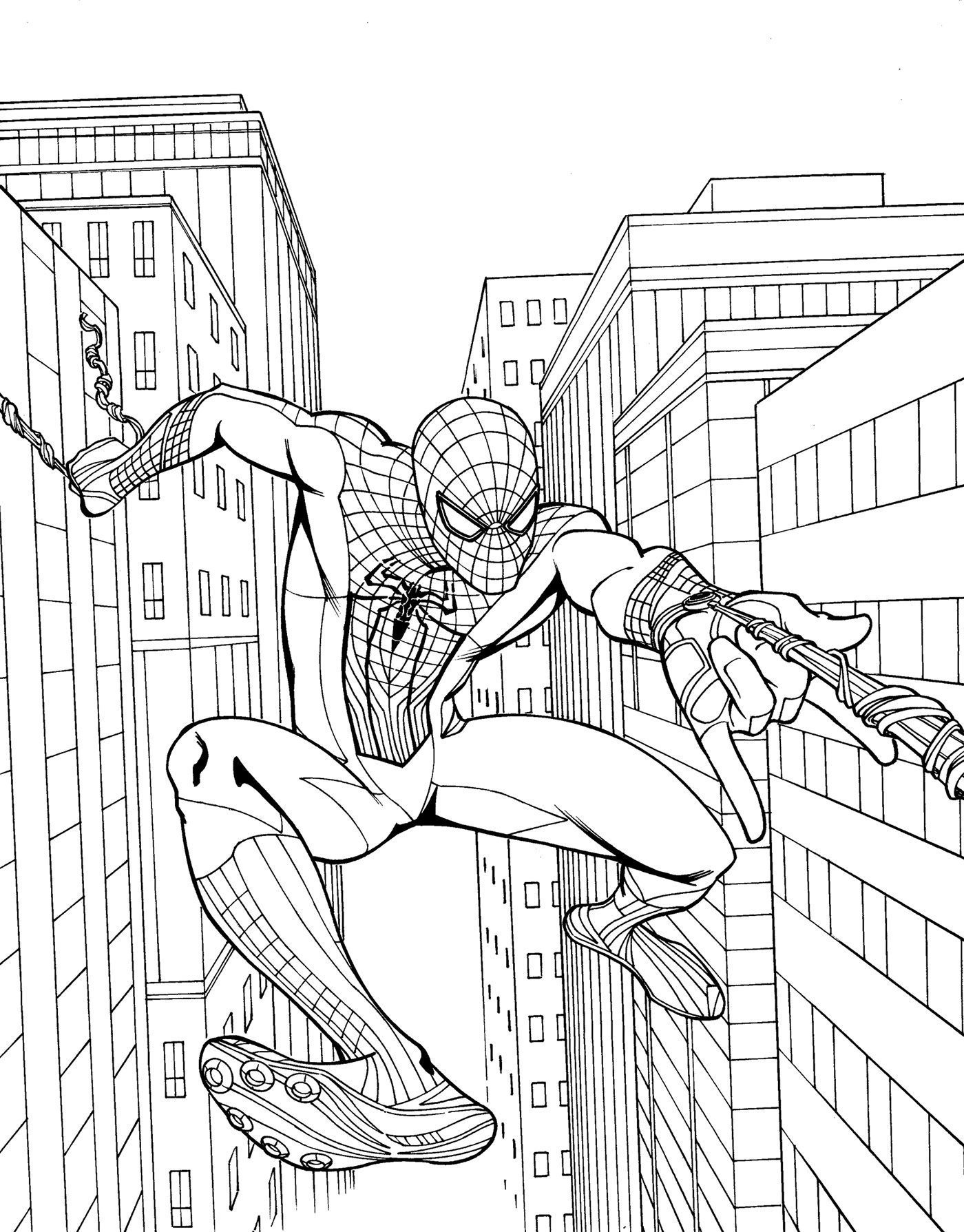 One of the most popular Spiderman coloring pages features the superhero swinging through the city skyline, with his web shooters in action. This dynamic image captures the essence of Spiderman in all his glory, and allows you to experiment with different colors to bring the scene to life.