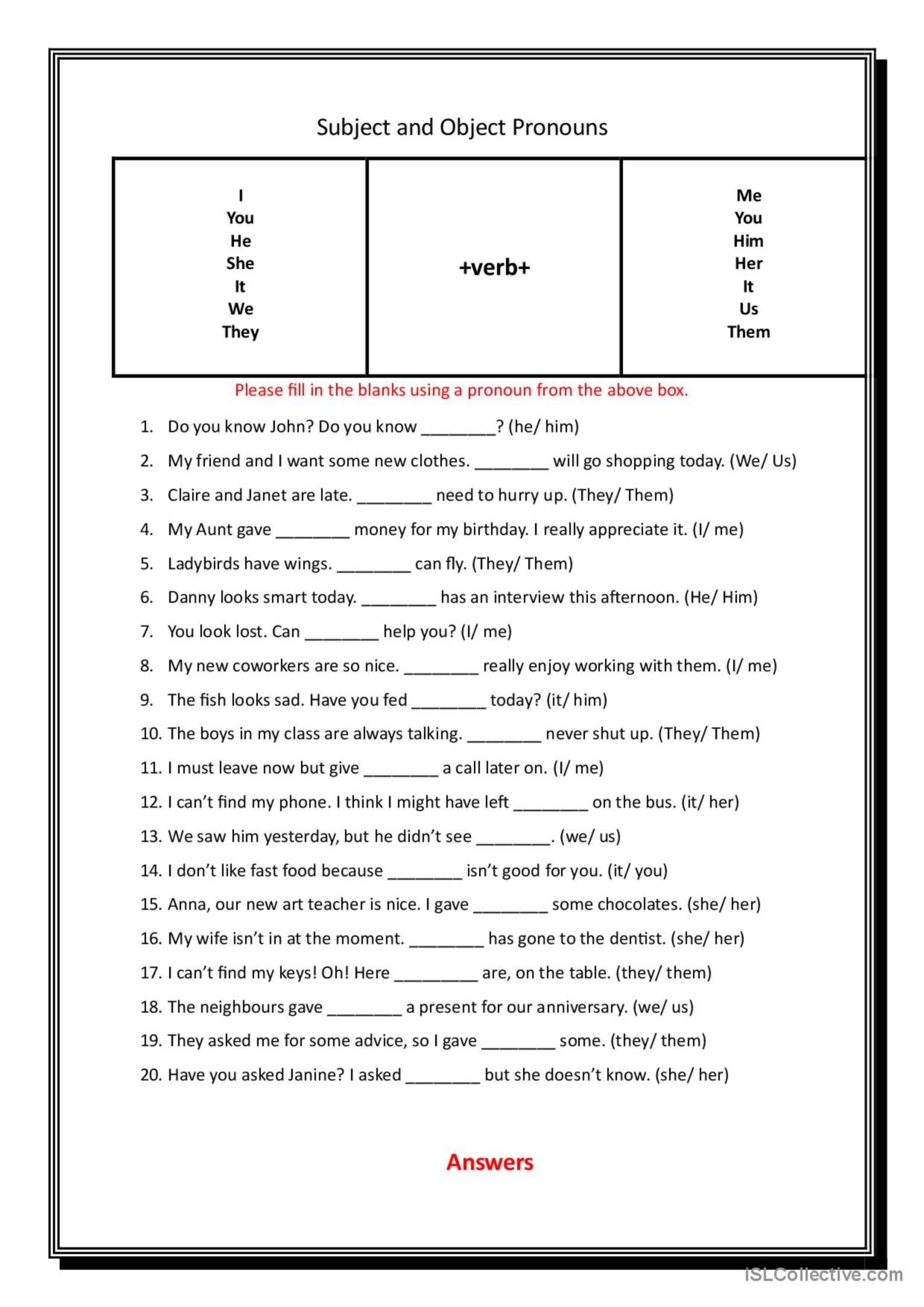 Worksheets are a great way to practice using subject and object pronouns in sentences. They provide a hands-on approach to learning and allow students to apply their knowledge in various contexts. Subject and object pronouns worksheets can help reinforce the rules and usage of pronouns, making it easier for students to remember and apply them in their writing and conversations.