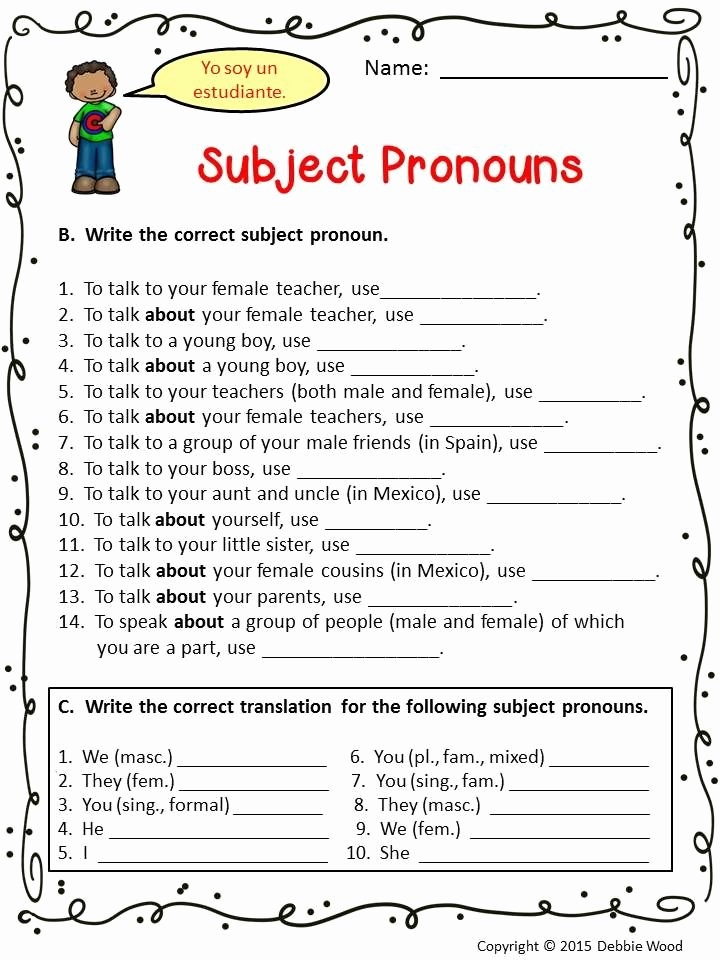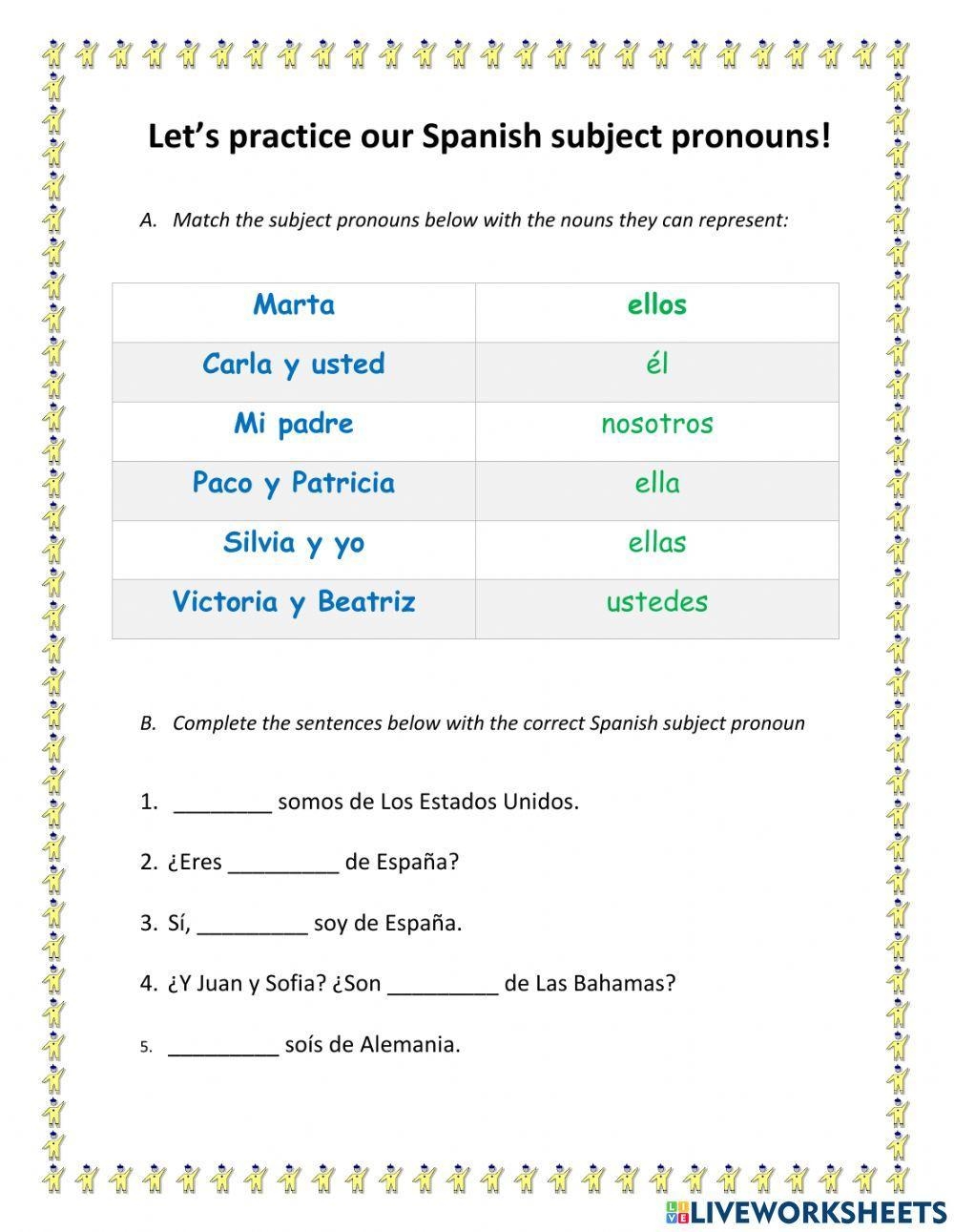 The subject pronouns Spanish worksheet may include exercises such as filling in the blank with the correct subject pronoun, matching pronouns with their corresponding English translations, and creating sentences using specific pronouns. These exercises help students practice using subject pronouns in different contexts and solidify their understanding of them.