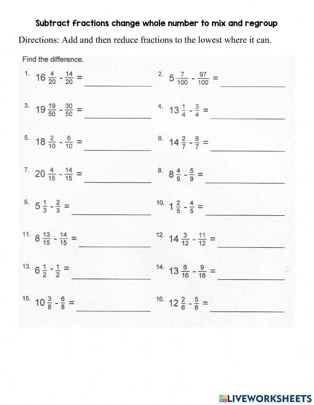 In conclusion, subtracting mixed numbers with regrouping can be a challenging skill for students to master. However, through the use of worksheets that provide practice and visual aids, students can develop a deeper understanding of the concept. By offering opportunities for students to regroup when subtracting mixed numbers, they can become more confident in their abilities and improve their overall math skills.