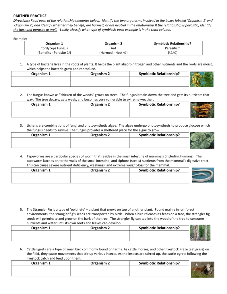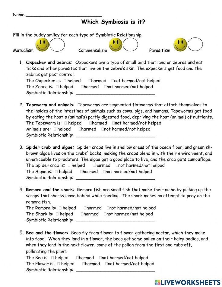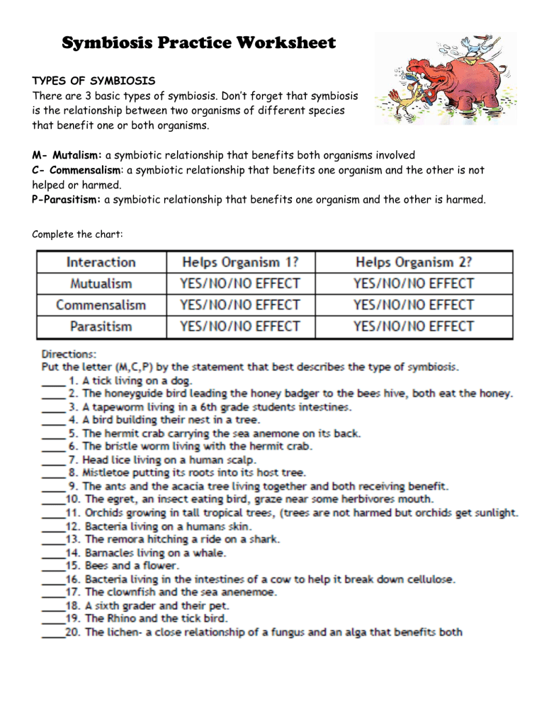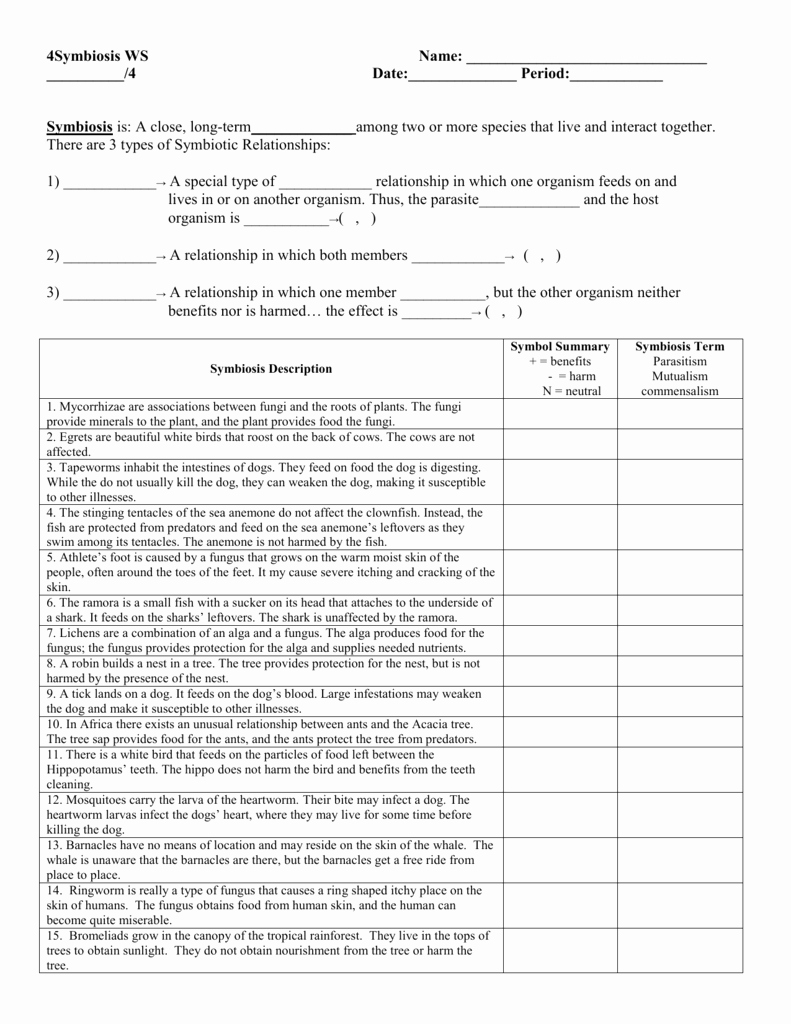 One way to reinforce the understanding of symbiosis is through a worksheet. A symbiosis worksheet can include questions and activities that challenge students to identify different types of symbiotic relationships, such as mutualism, commensalism, and parasitism. These worksheets can help students grasp the complexities of symbiosis and how it shapes the natural world.