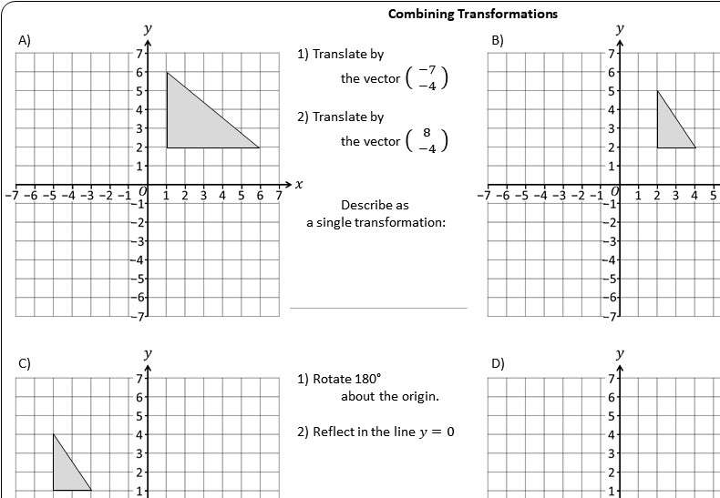 Furthermore, transformation worksheets can be tailored to different levels of difficulty, making them suitable for students at various skill levels. Beginners can start with simple exercises that focus on basic transformations, while more advanced students can tackle complex problems that require a deeper understanding of geometric principles. This flexibility allows teachers to differentiate instruction and provide targeted practice for each student.