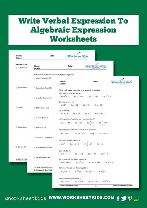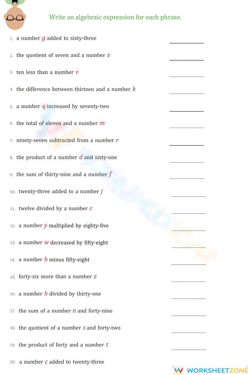 One common type of exercise found in translating expressions worksheets is translating verbal expressions into algebraic expressions. In this type of exercise, students are given a word problem or a sentence describing a mathematical situation, and they need to convert it into an algebraic expression using variables and mathematical symbols. This helps students practice translating real-world problems into mathematical language.