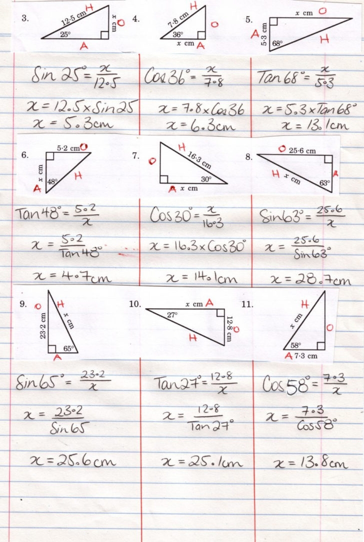 These answers demonstrate the relationship between the angles and sides of a right triangle, as defined by the trigonometric ratios. By practicing with similar problems and comparing your solutions to these answers, you can improve your understanding of trigonometry and confidently tackle more complex problems.