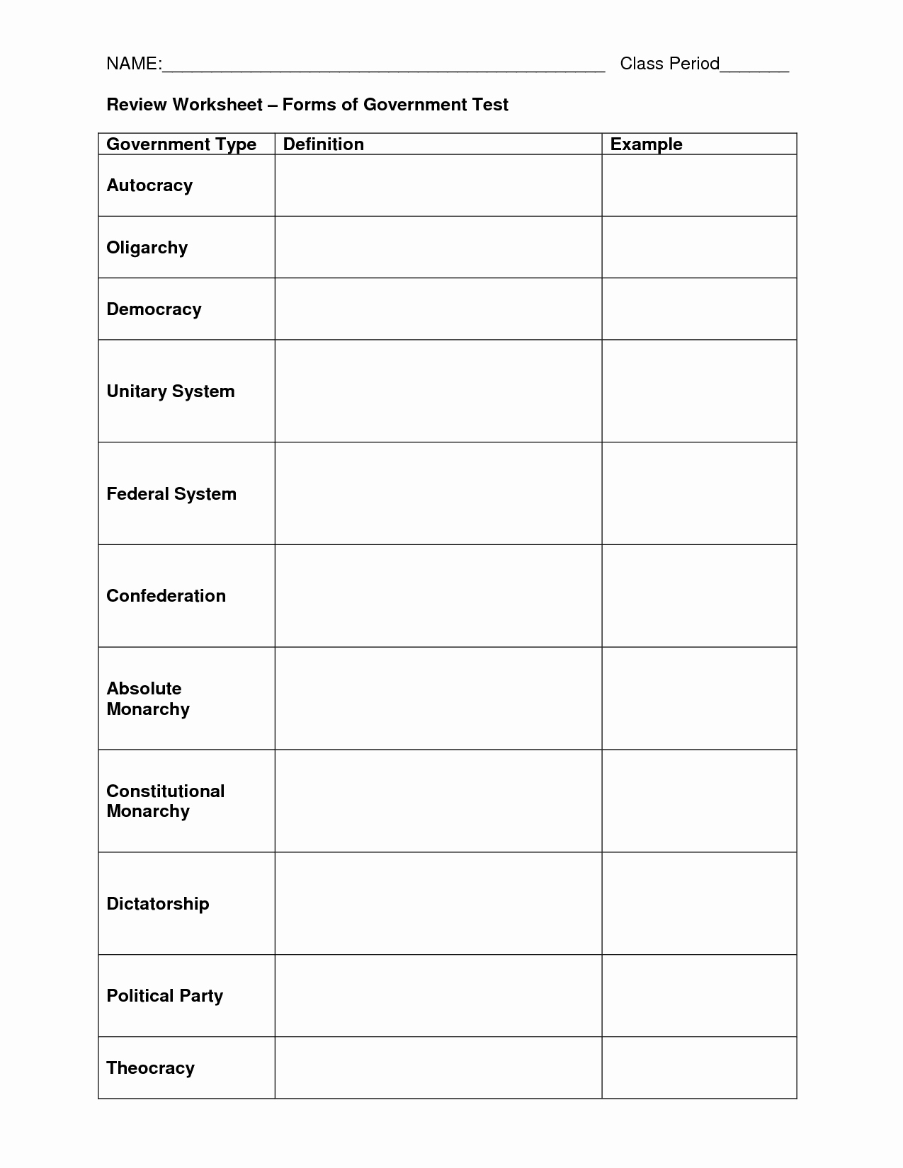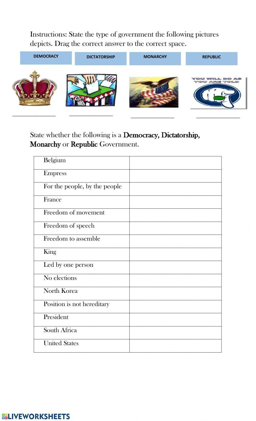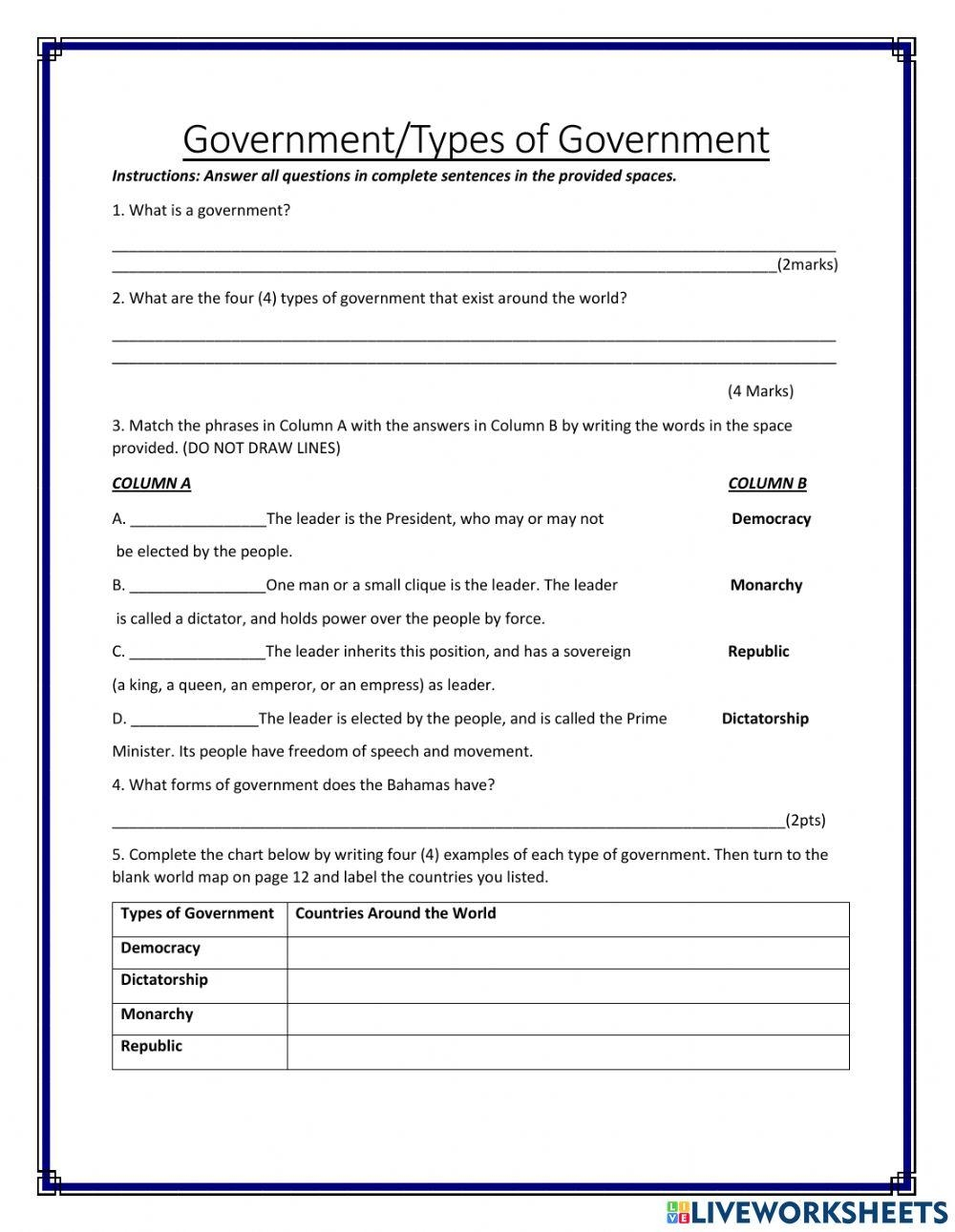 Government systems play a crucial role in shaping the functioning of a society. Understanding the various types of government is essential for students to have a well-rounded knowledge of political systems. One effective way to teach students about different forms of government is through the use of worksheets. These worksheets can help students grasp the concepts and characteristics of each type of government in a structured and interactive manner.