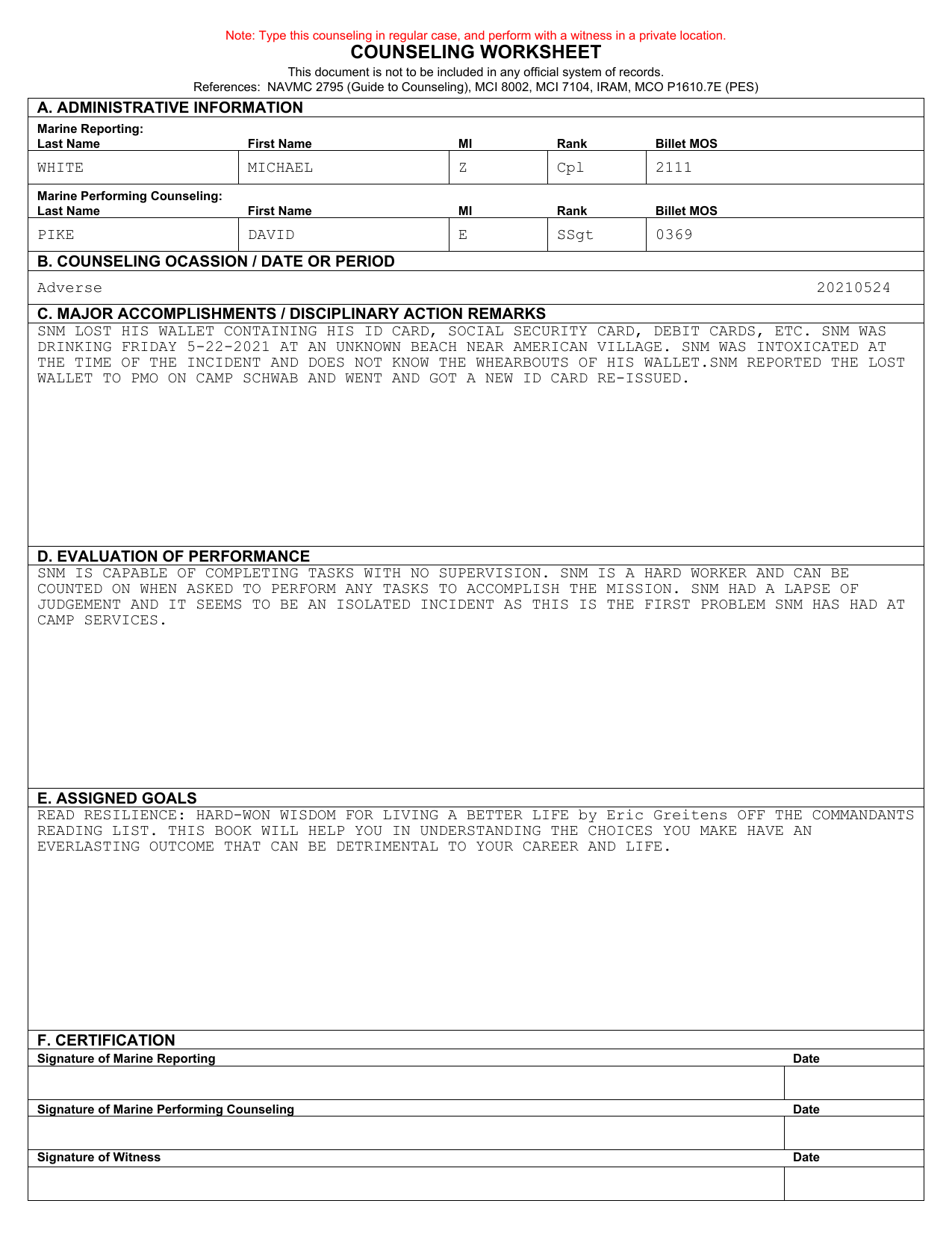USMC Monthly Counseling Worksheet