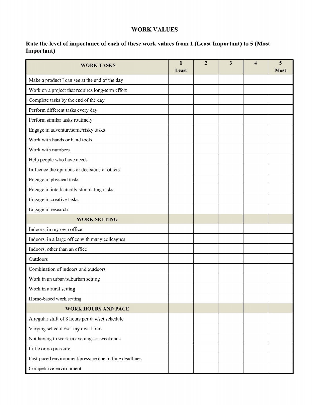 Values Inventory Worksheet