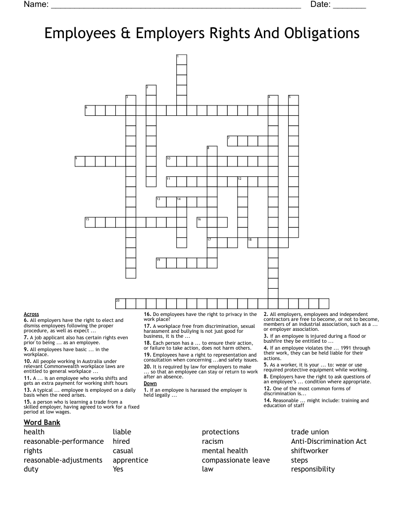 Workers Rights Practice Worksheet Crossword Puzzle Printable Online
